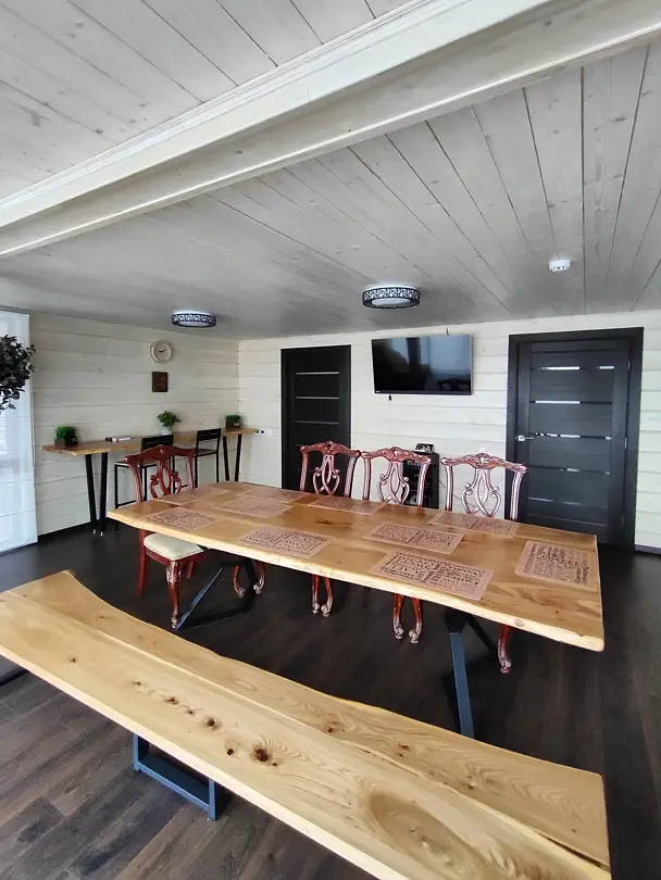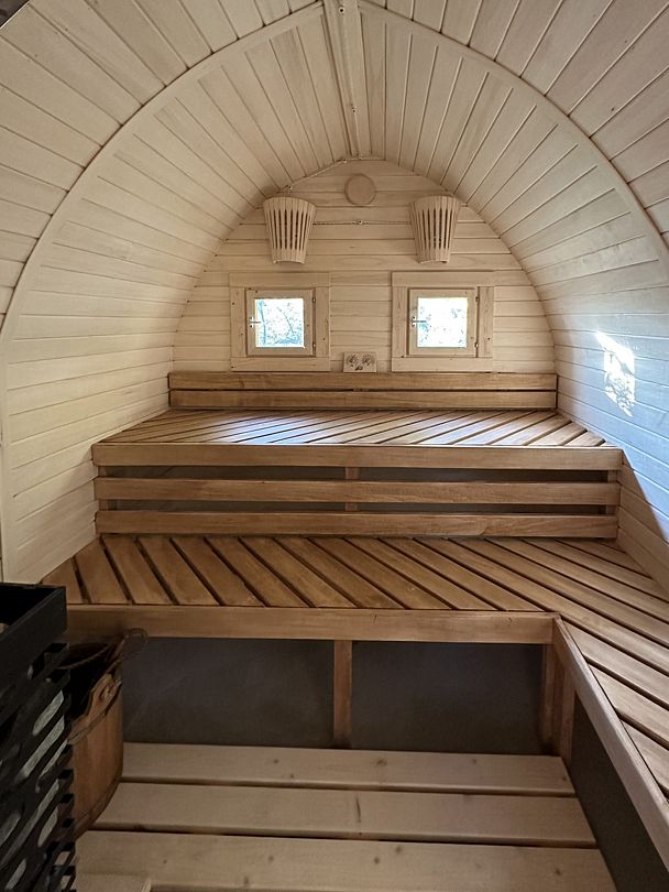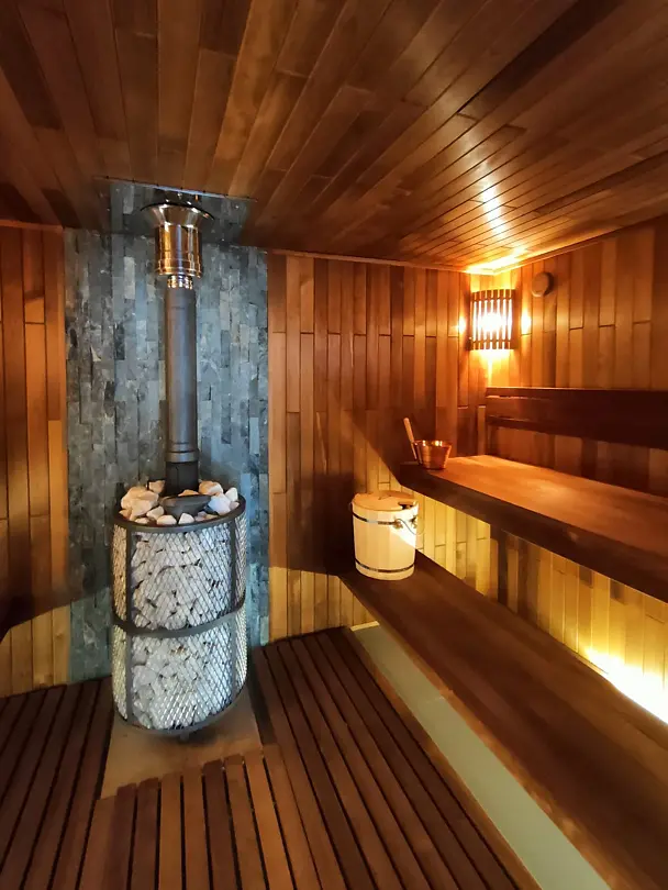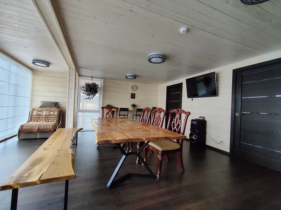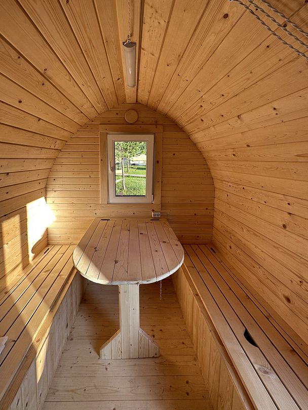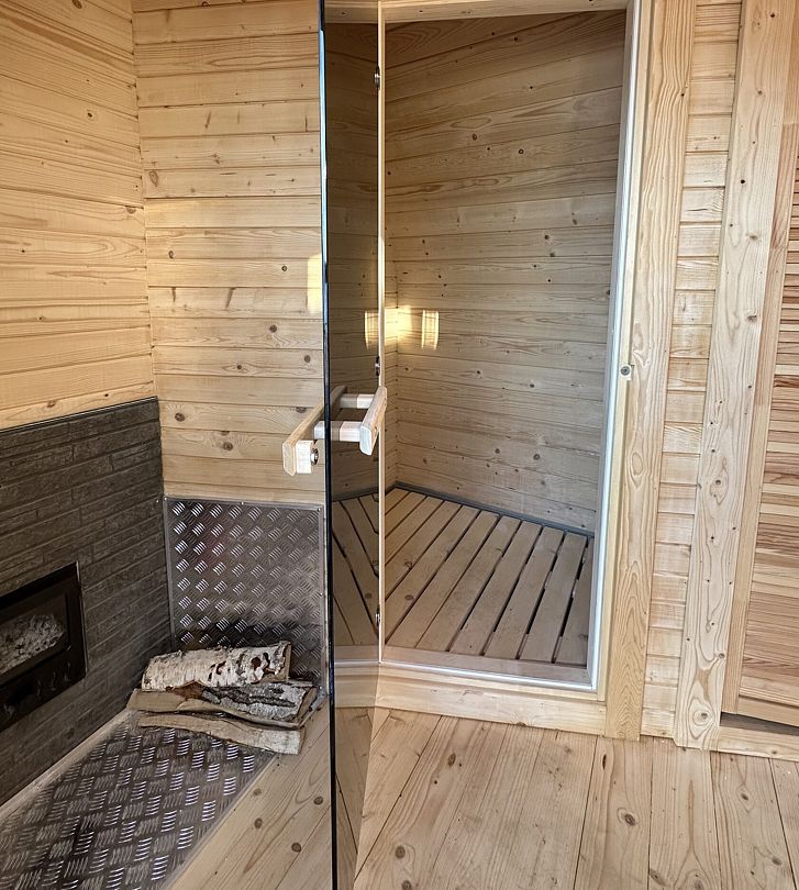 Внутри здания есть парная, душ и зона отдыха, где установлен обеденный стол, телевизор и музыкальный центр. Насладитесь ароматом свежесрубленных дров и теплом мягкого пара, позвольте себе полностью расслабиться и забыть о повседневных заботах.