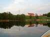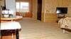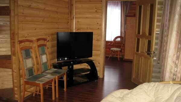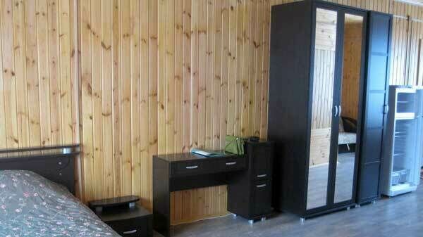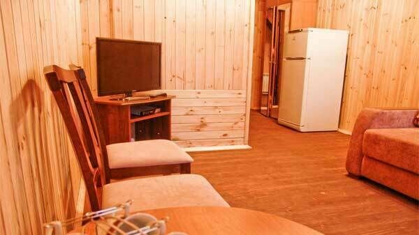 Просторная комната с отдельной нишей, в которой стоит раскладной диван, предназначенный для ребенка. Впрочем, диван полно-размерный, на нем вполне может спать и взрослый человек. В номере два окна через которые открывается прекрасный вид на озеро и на территорию базы отдыха. В номере есть большой вместительный холодильник, телевизор.