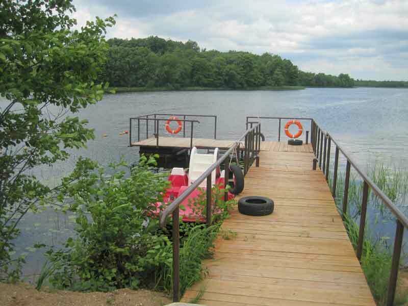 На 1-ом этаже: баня, парилка, душевая кабина, кадушка с холодной водой; обеденный зал, спутниковое ТВ, комплект посуды, микроволновая печь, муз. центр, холодильник, эл. чайник, оборудованная площадка с мангалом, пирс с выходом к озеру.