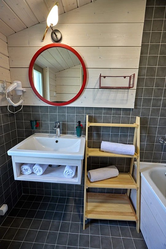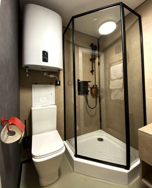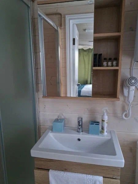 - санузел с душевой кабиной, большой раковиной, туалетом и феном для волос;