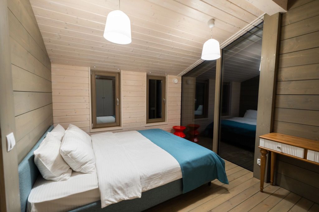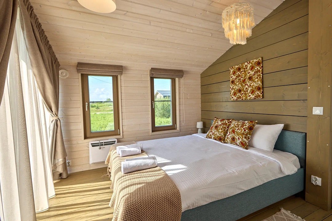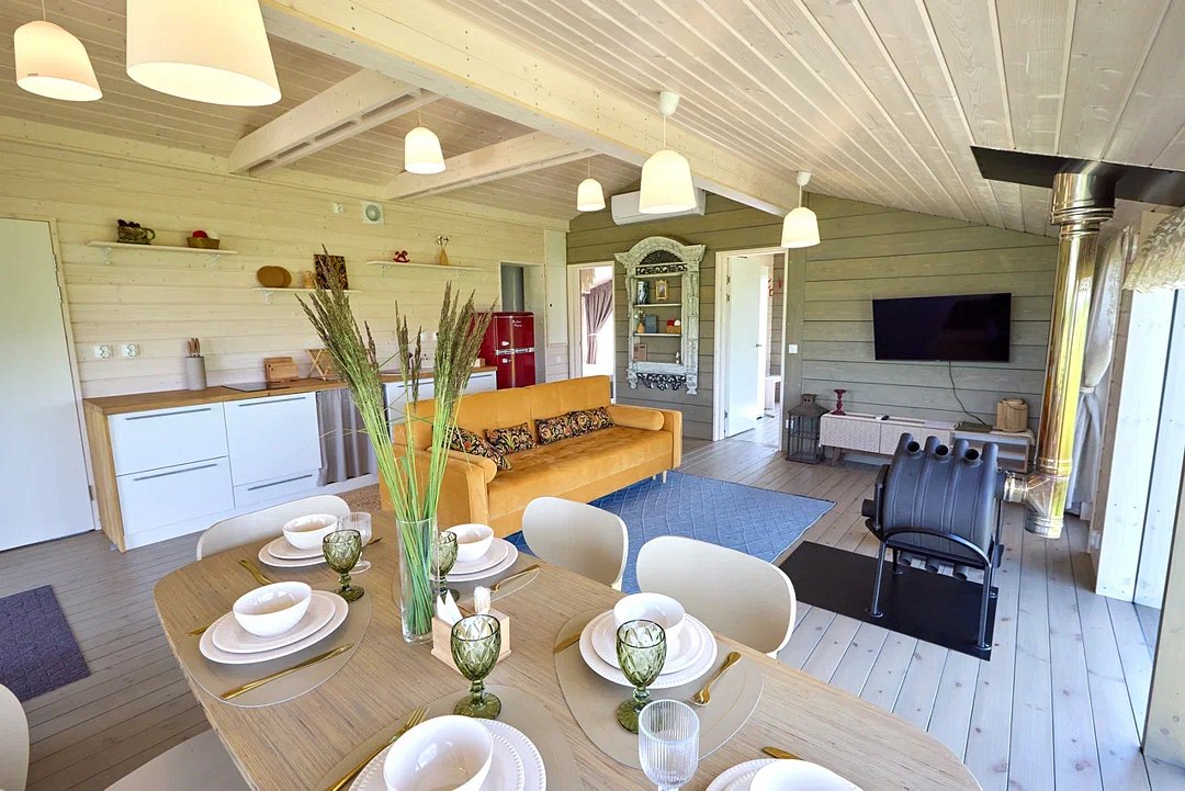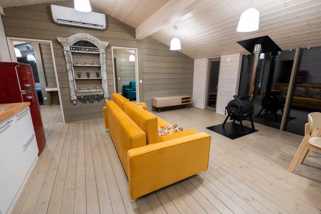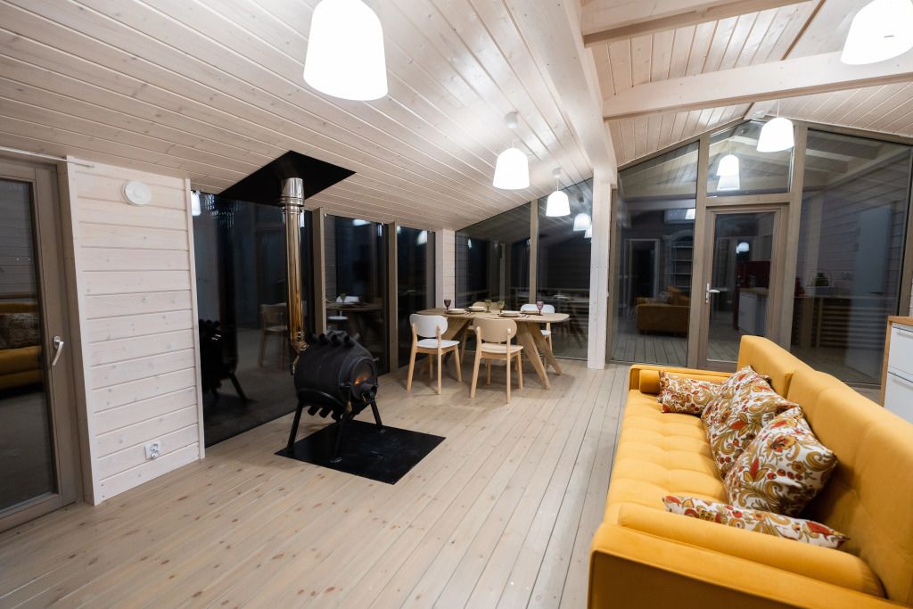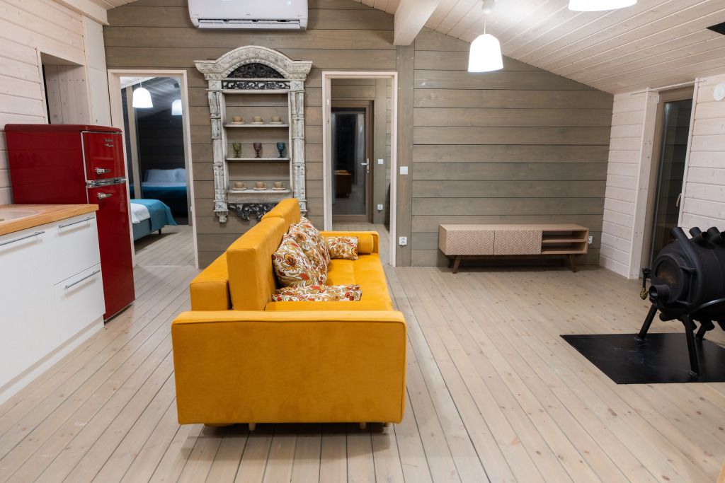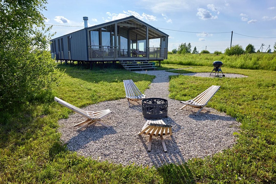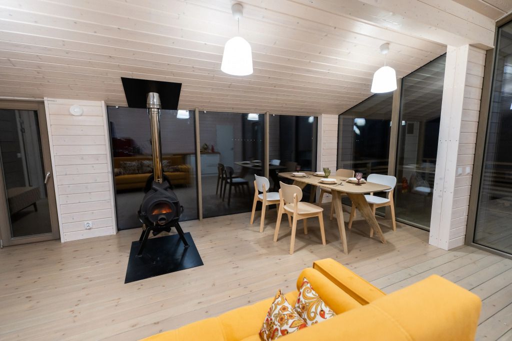 2 спальни, просторная кухня-гостиная с печью, панорамные окна с видом на лес и чудесные закаты. Дома находятся в уединении от других объектов размещения и имеют собственную парковку. Идеальный вариант для длительного проживания.