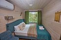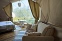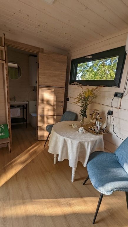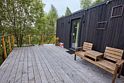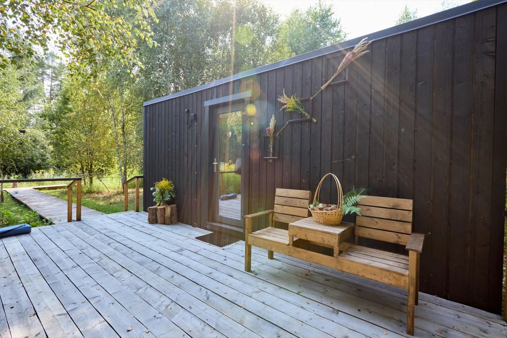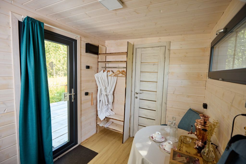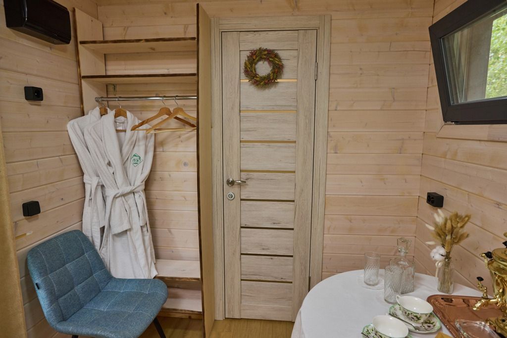 Домик имеет собственную террасу, при выходе на которую вы оказываетесь среди деревьев. Домики расположены на максимальном удалении от общих зон глэмпинга, в нём можно насладиться тишиной и уединением.