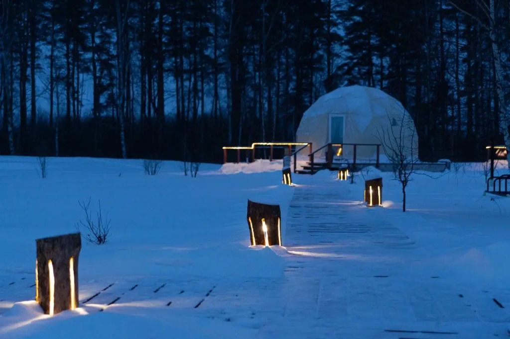 Приветственный горячий шоколад и размещение в теплых домиках или сферах со всеми удобствами и подогреваемыми полами. Ужин в кафе и вечер у печи-камина с чтением сказок (игра в настолки).