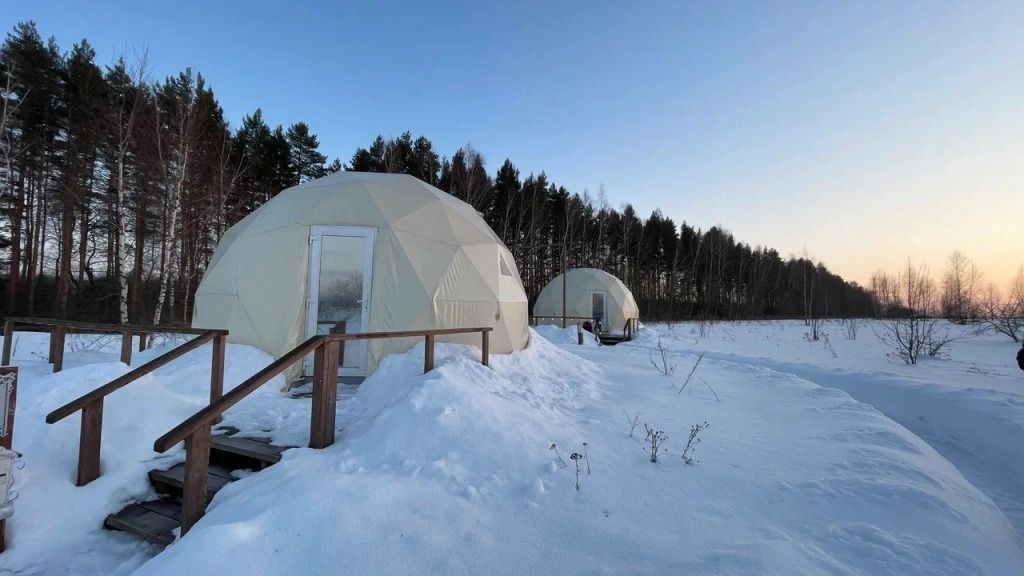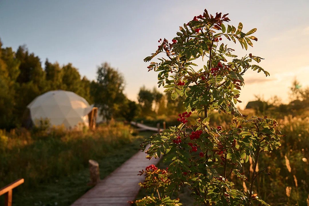 Размещение в уютном домике или сфере с панорамным видом на лес или закат. Приветственный набор с игристым и фруктовой нарезкой.