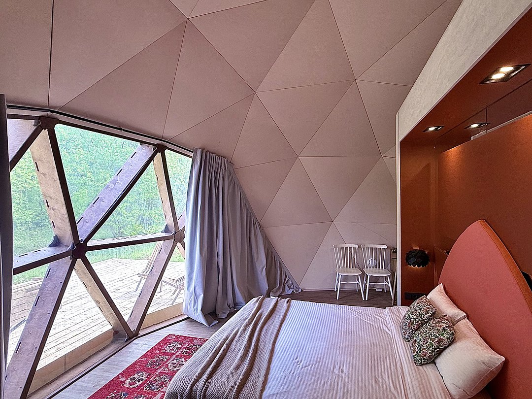 К вашим услугам уютные домики на деревьях, просторные сферы, удобные геокупола и отдельный ДубльДом. В каждом домике есть все удобства: санузел, холодильник, чайник и удобная кровать.