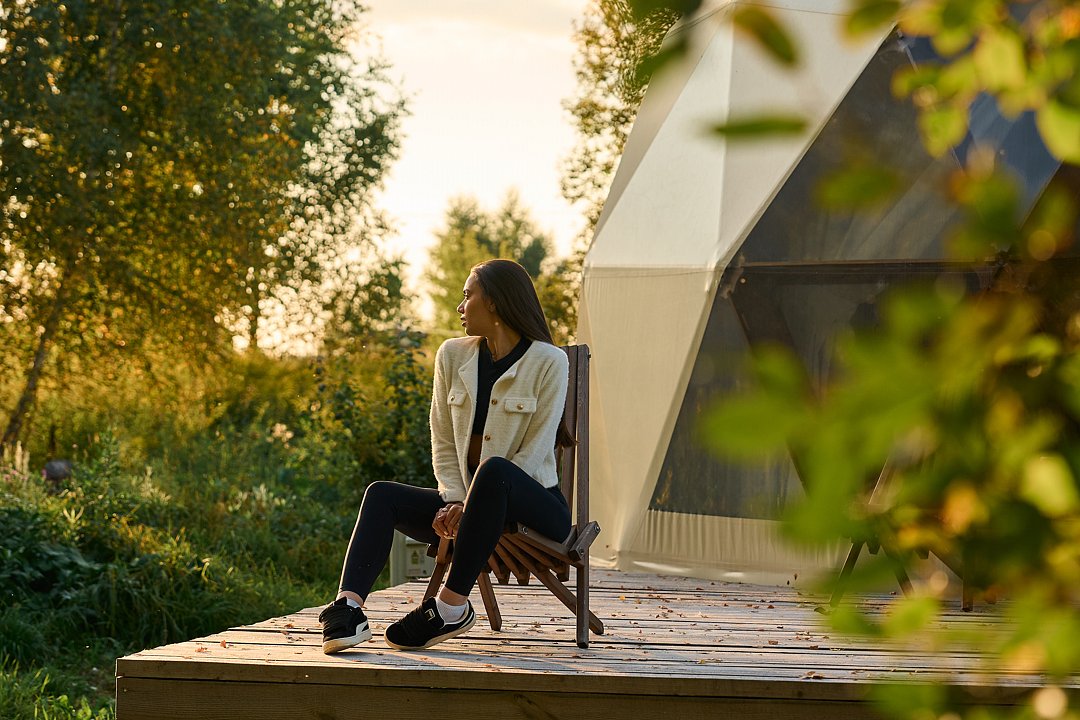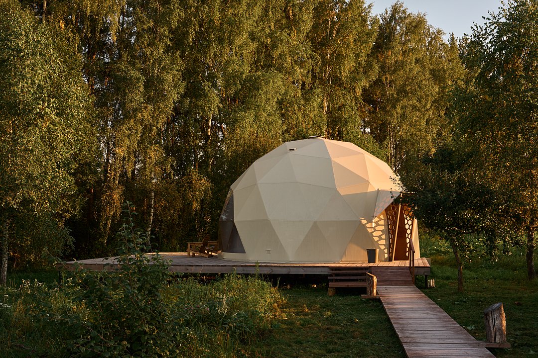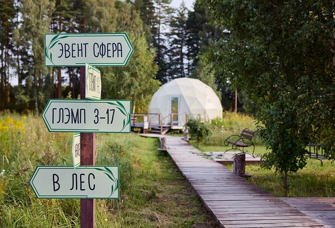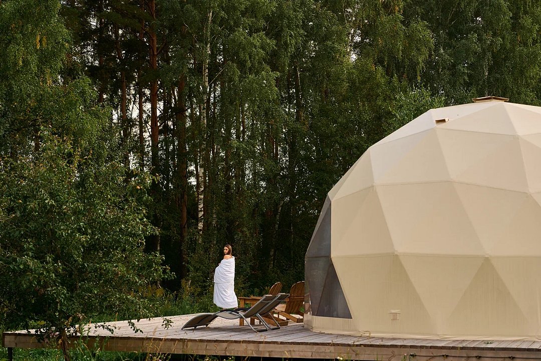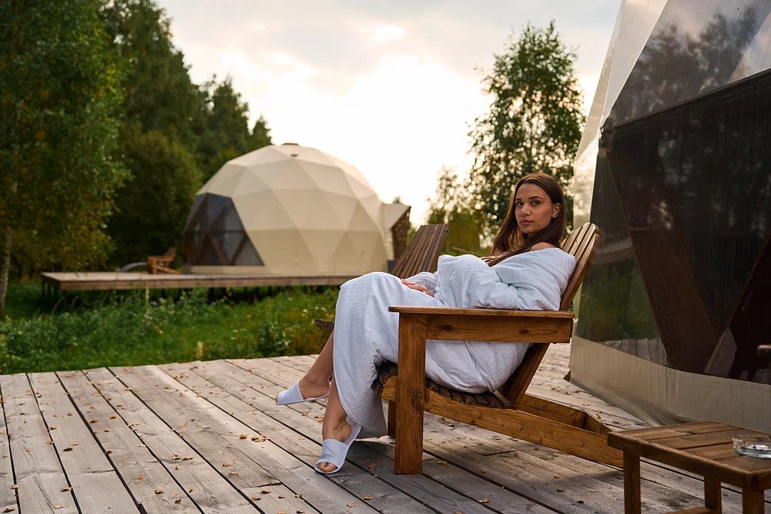 Отдельно стоящие сферы с панорамными видами. Индивидуальная терраса с видом на лес. 3 сферы с авторским дизайном, соединяющим историю и современность.