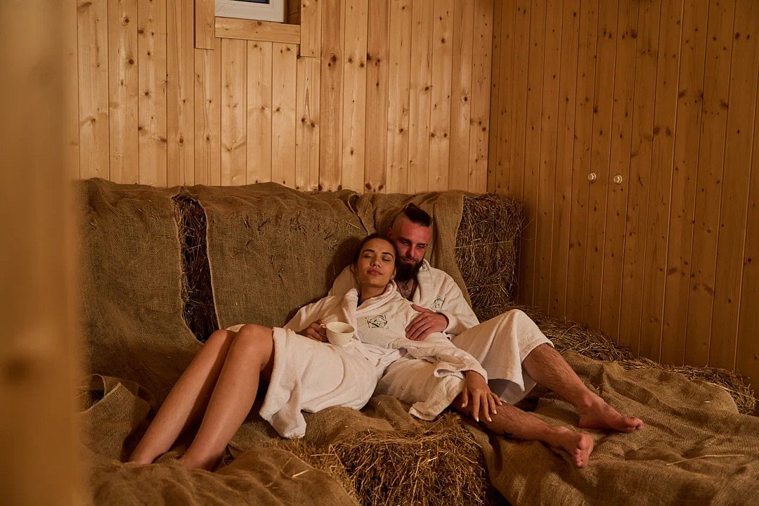 Прогулка по лесной тропе или катание на велосипедах. Пикник на природе с изысканными закусками (летом по желанию). Обед в кафе. Совместный спа-сеанс в Японской бане Офуро и массаж для двоих. Ужин в кафе.Вечером — просмотр фильма или романтическая Игра Pur-Pur.