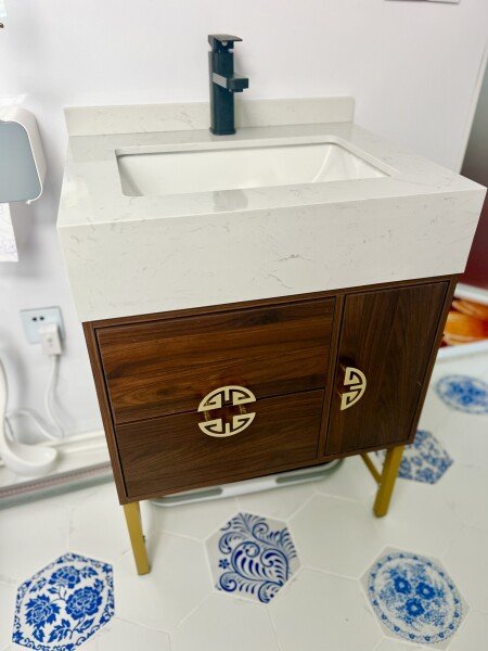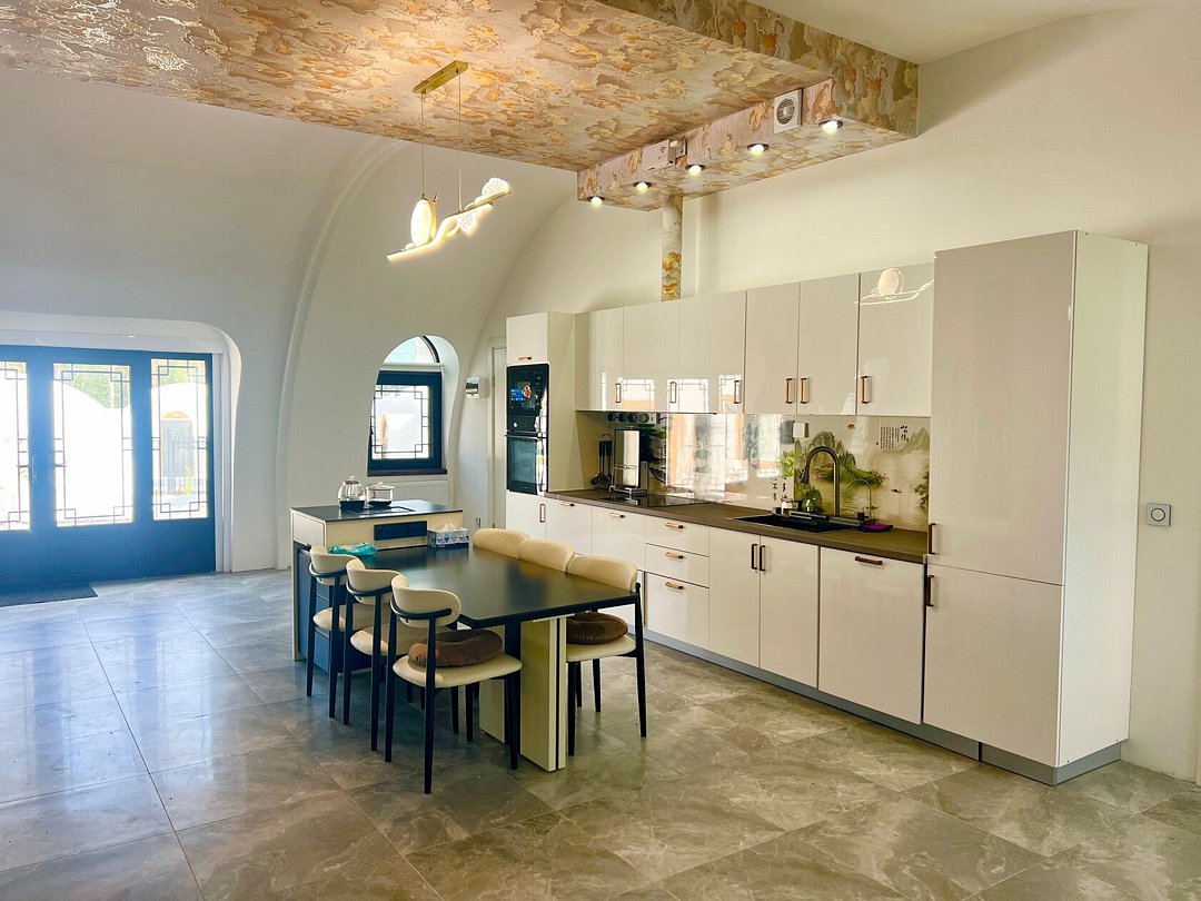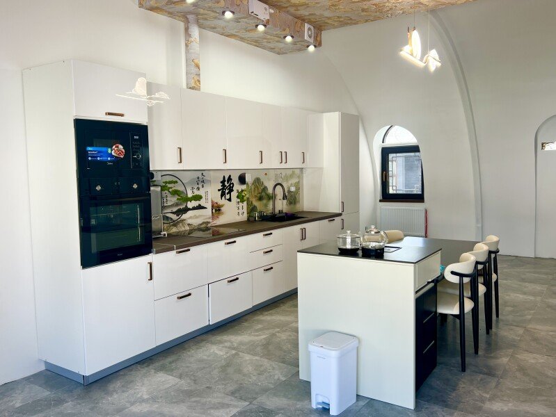 Роскошная китайская кухня: Открытая кухня сочетает китайскую эстетику с современными удобствами, имеет большой кухонный остров и электрический чайник с автоматической подачей воды. Все оборудование укомплектовано: микроволновая печь, холодильник, посудомоечная машина, духовка, индукционная варочная панель, измельчитель отходов, система фильтрации воды, многофункциональная раковина и т.д.