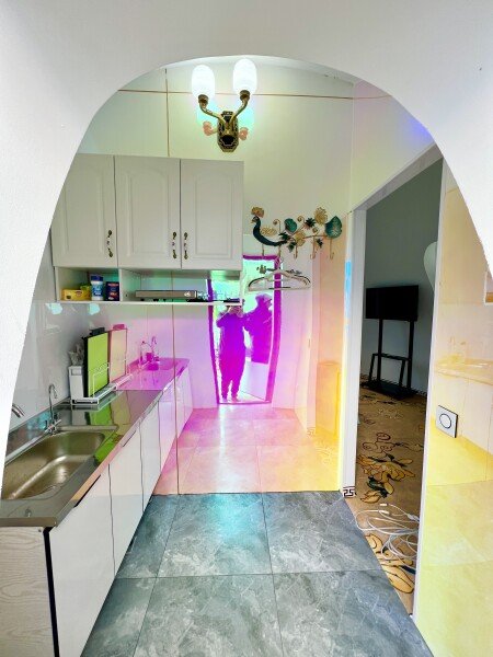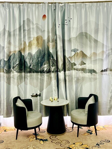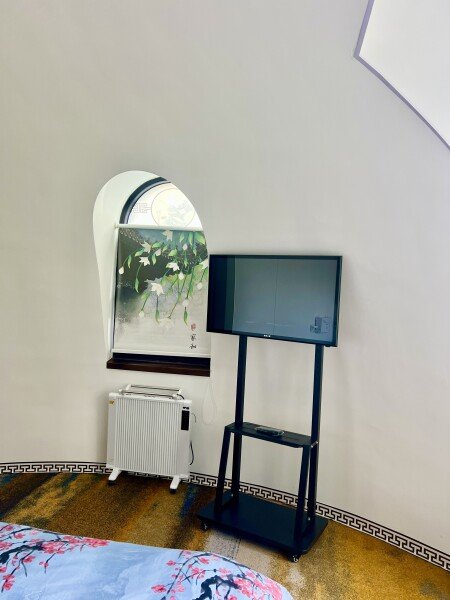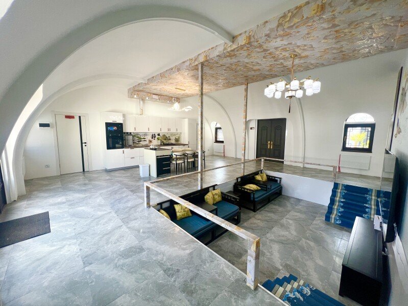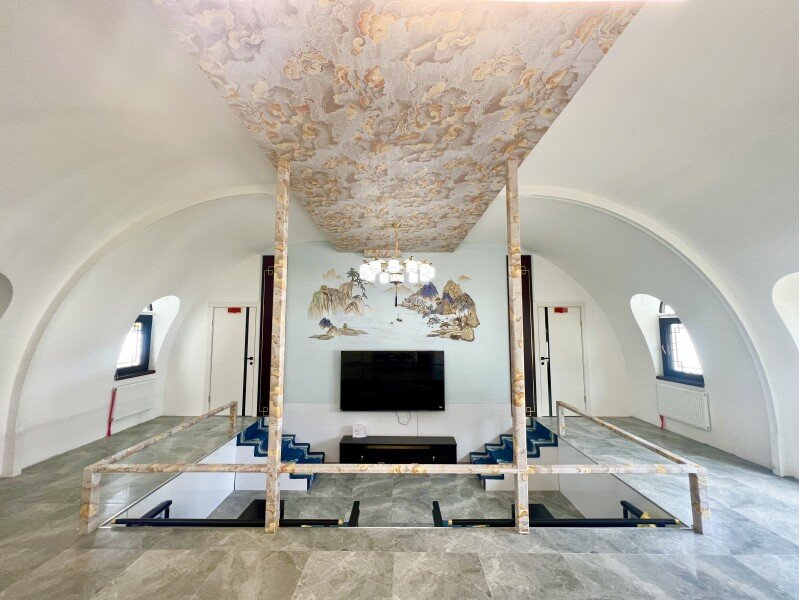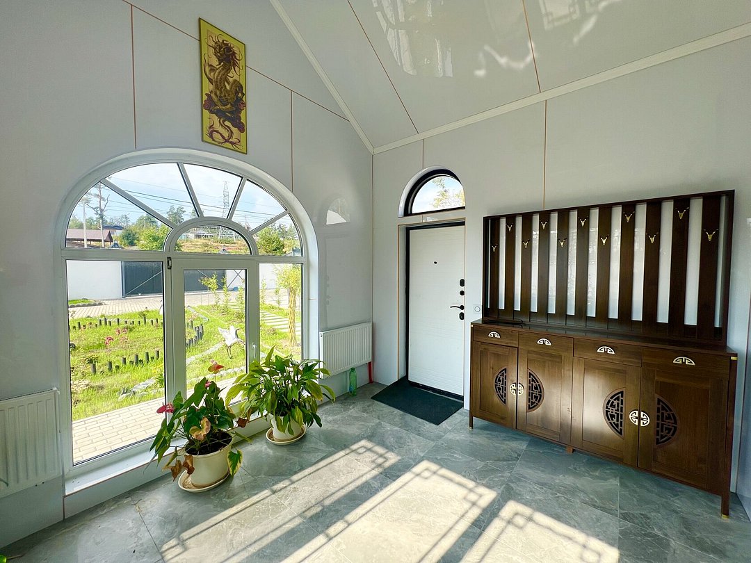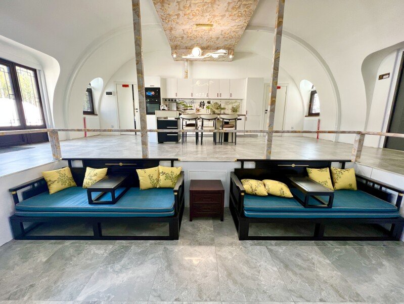 Утопленная гостиная: Гостиная выполнена в инновационном стиле с двумя традиционными китайскими кроватями «архат» (лохань). В центре установлен огромный телевизор шириной два метра со встроенной российской приставкой Sberbox, предоставляющей доступ ко всем российским телеканалам. Это погружает вас в атмосферу личного китайского домашнего кинотеатра.