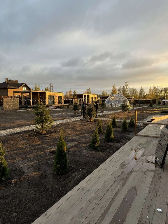 Территория включает в себя 6 уединенных «умных» домиков с уникальным дизайном и большими террасами, костровые зоны, чаны для релакса и отдыха, дровяную мини-баню, мангалы и барбекю, купольную беседку для совместных мероприятий, пункт проката инвентаря для отдыха.