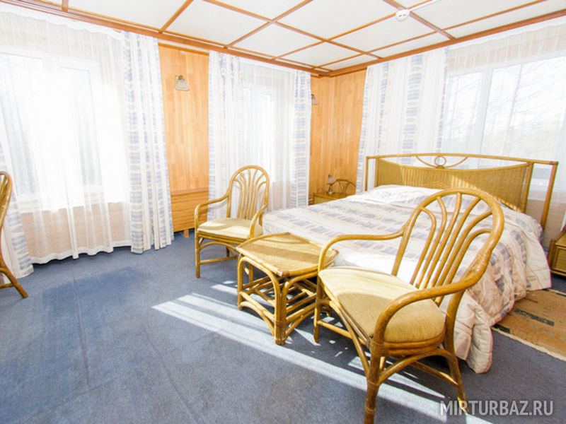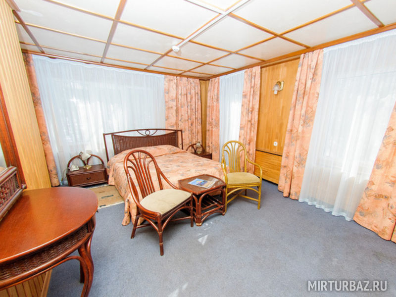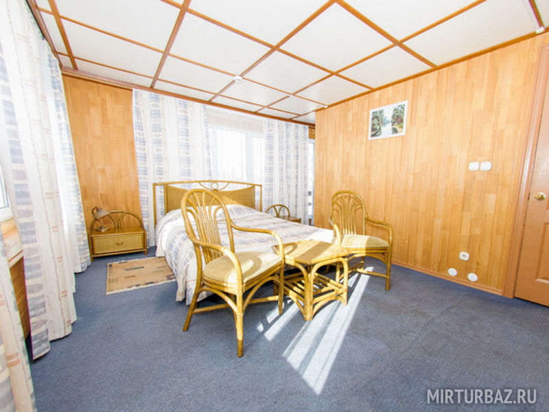 В номере: Двуспальная кровать, санузел, душевая кабина, ТВ, холодильник, чайник, шкаф, кресло.