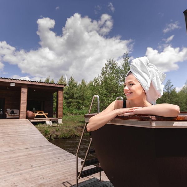 Отдыхая в теплой воде на свежем воздухе, вы ощущаете полное расслабление, уединение, гармонию с природой и своим телом. Банный чан с комфортом вмещает 4-6 человек.