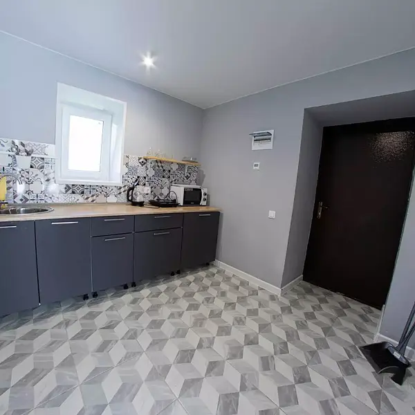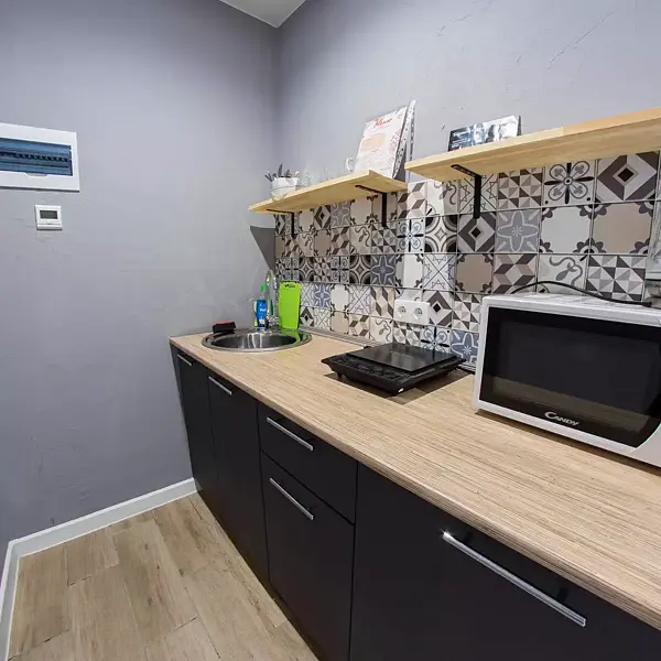 - микроволновка, холодильник, чайник, набор посуды, (тарелки, ложки, вилки, стаканы).