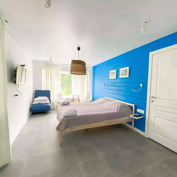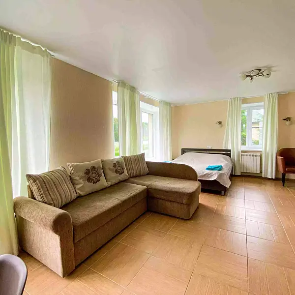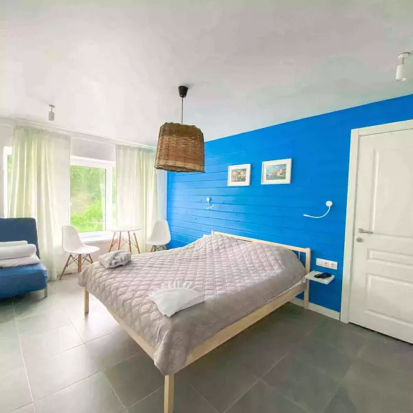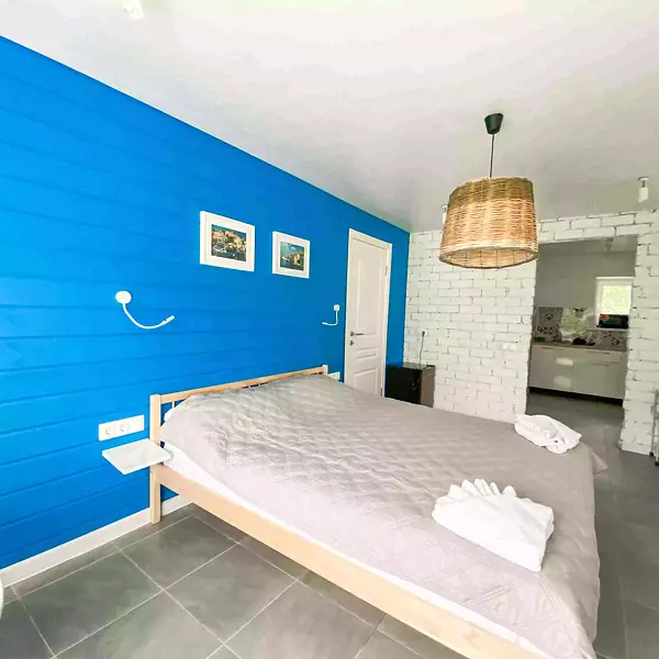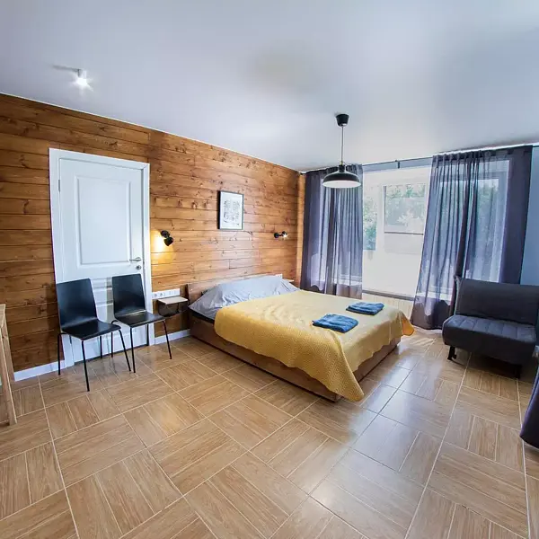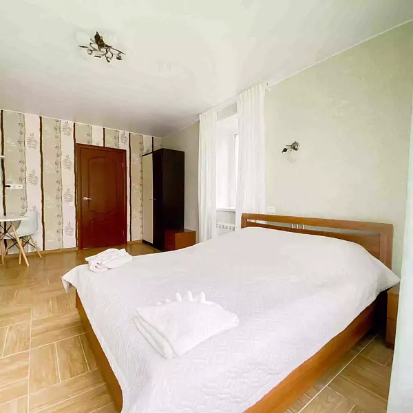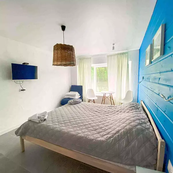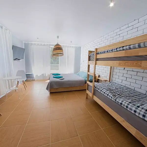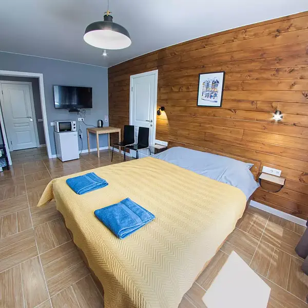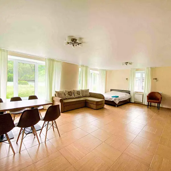 - 1 комната: большая двуспальная кровать, двуспальный диван, стол со стульями, телевизор, платяной шкаф;