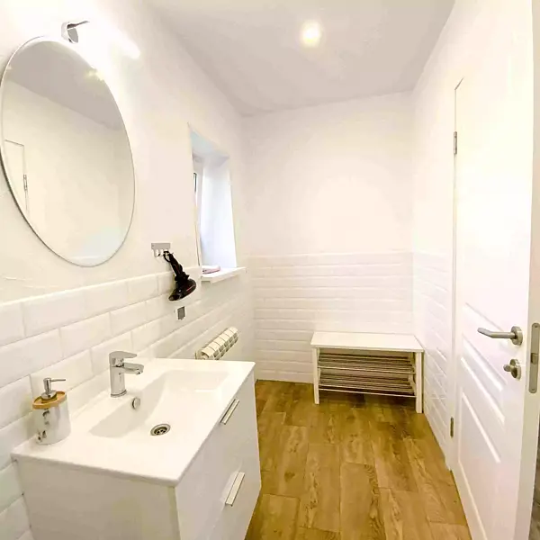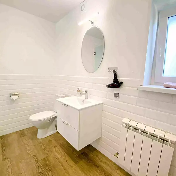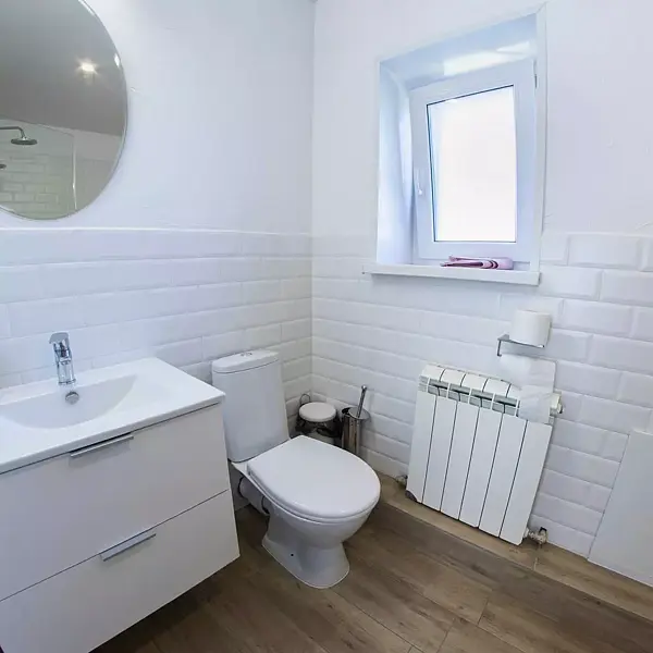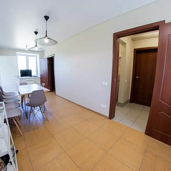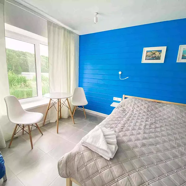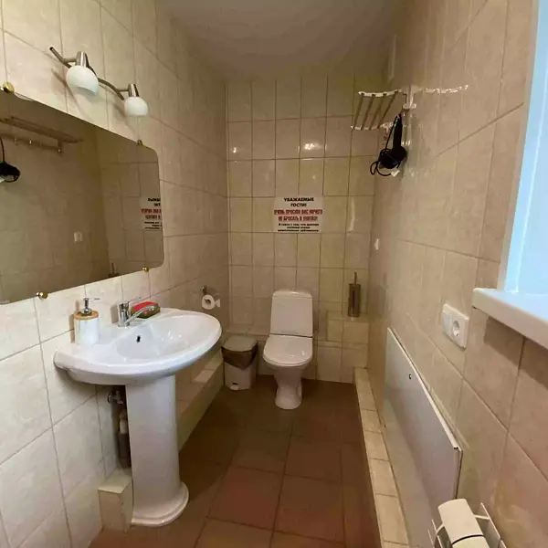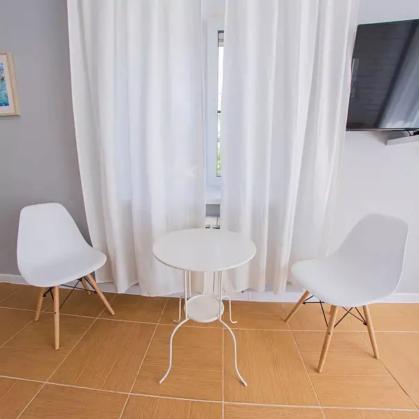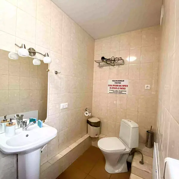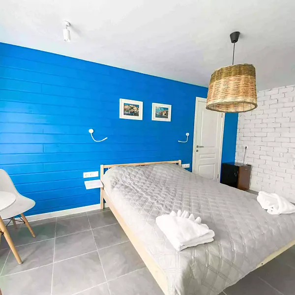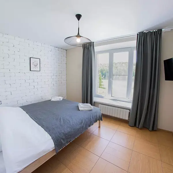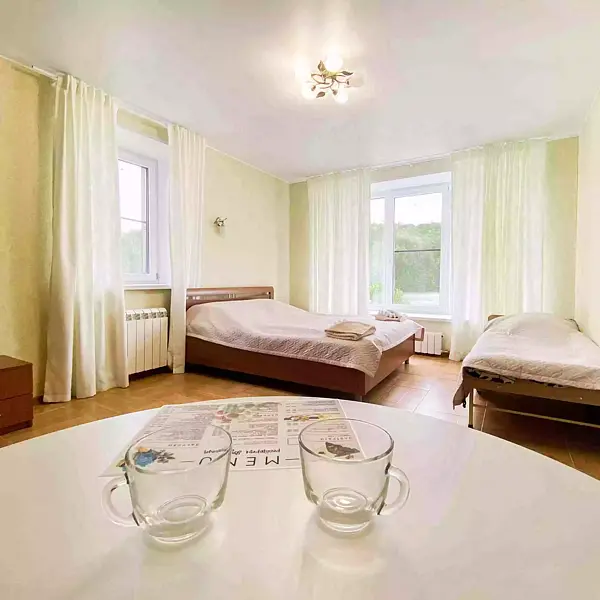- 1 комната: большая двуспальная кровать, двуспальный диван, стол со стульями, телевизор, платяной шкаф;
