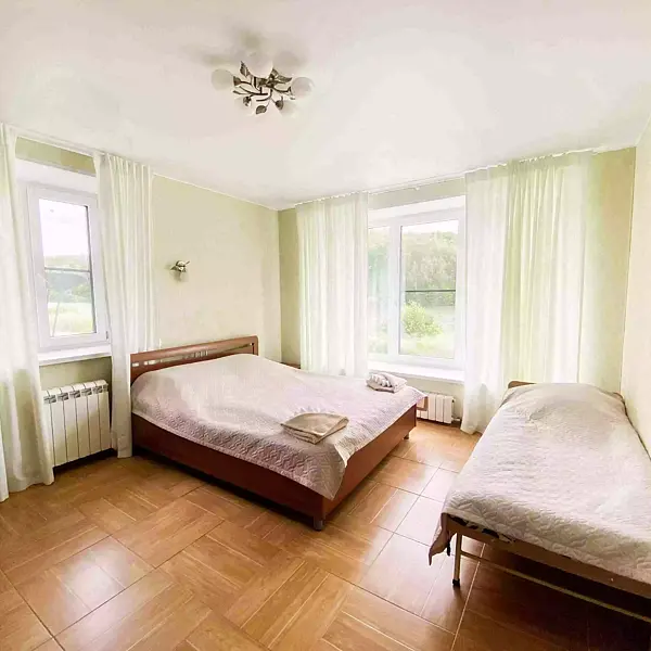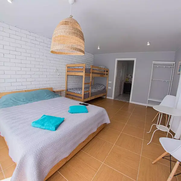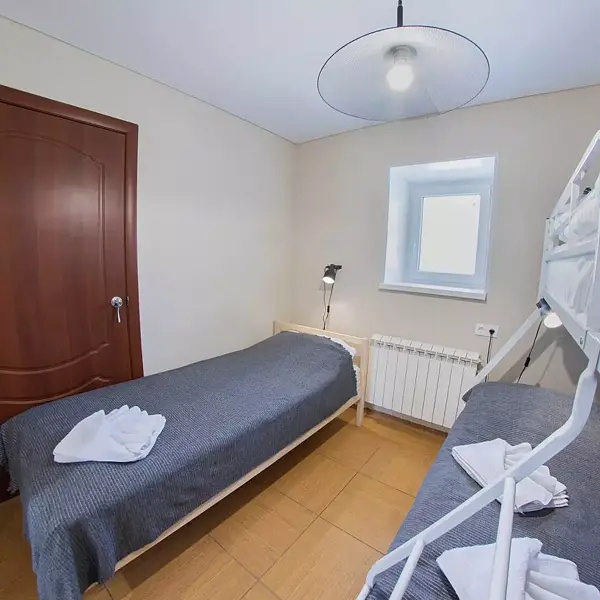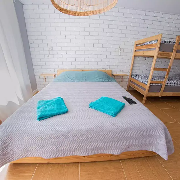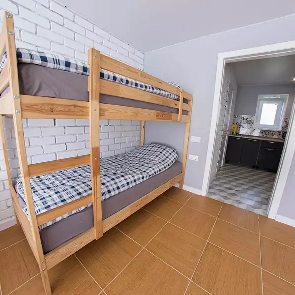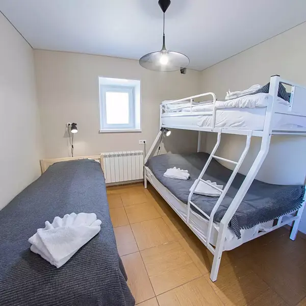- третья комната с двухъярусной кроватью (внизу двухъярусной двуспальная кровать, вверху односпальная), односпальная кровать;