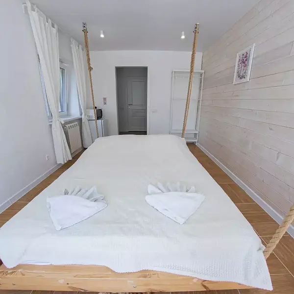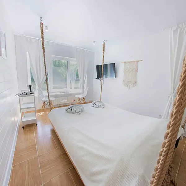 - большая двуспальная кровать-качели с подсветкой, столик со стульями, телевизор, стеллаж;