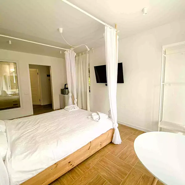 - большая двуспальная кровать с романтичным балдахином и фонариками, столик со стульями, телевизор, стеллаж;