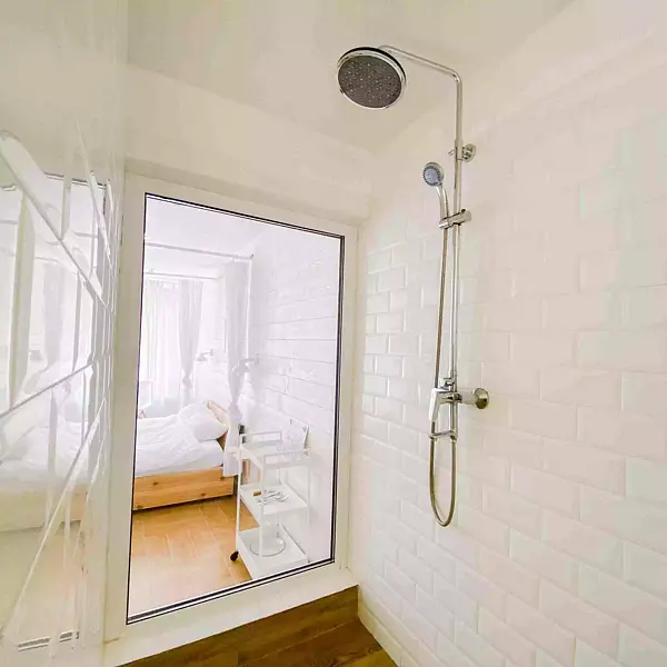 - индивидуальный санузел: душ, туалет. Прозрачная стенка между душем и комнатой;