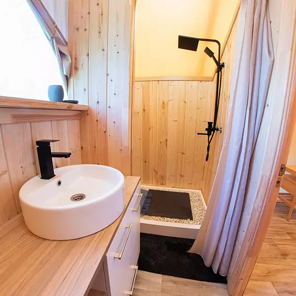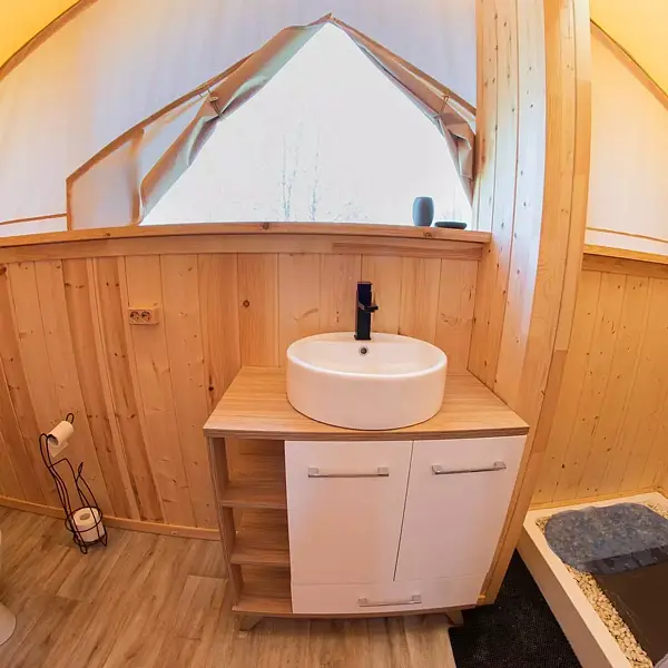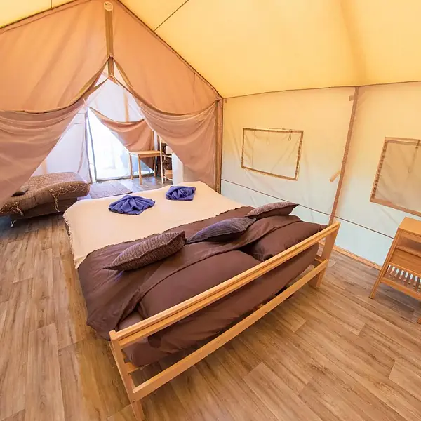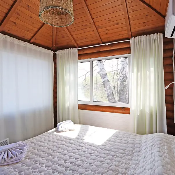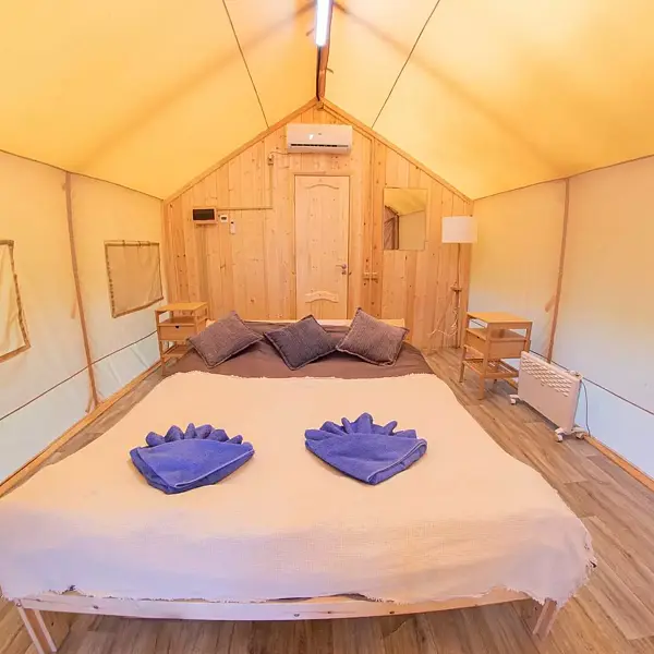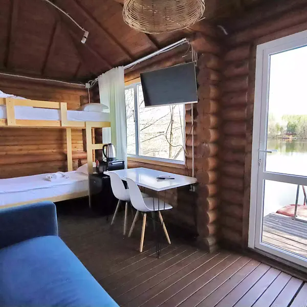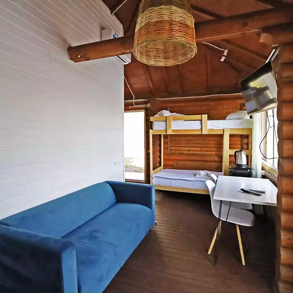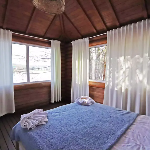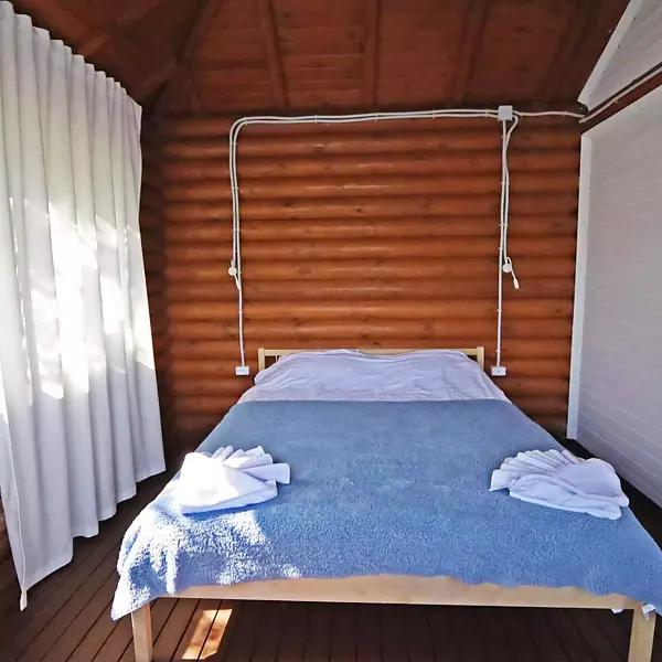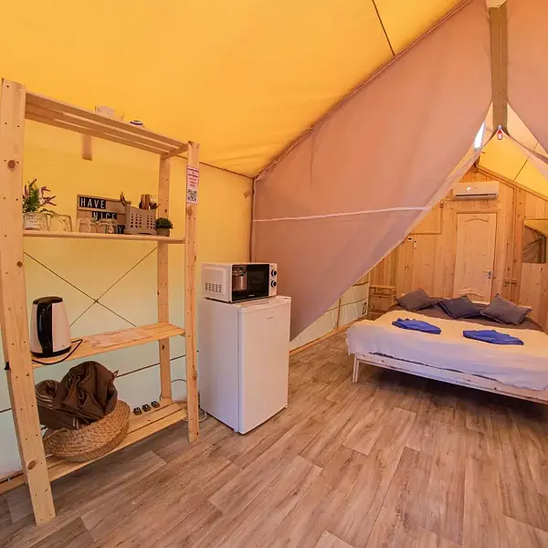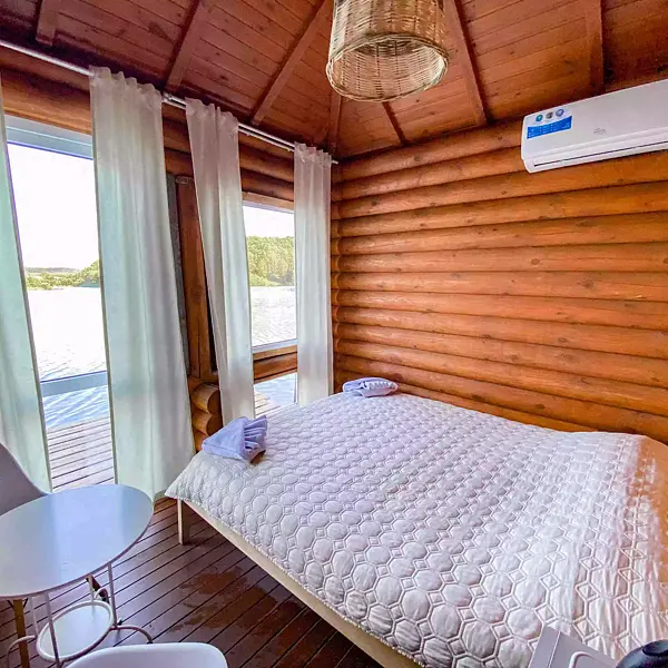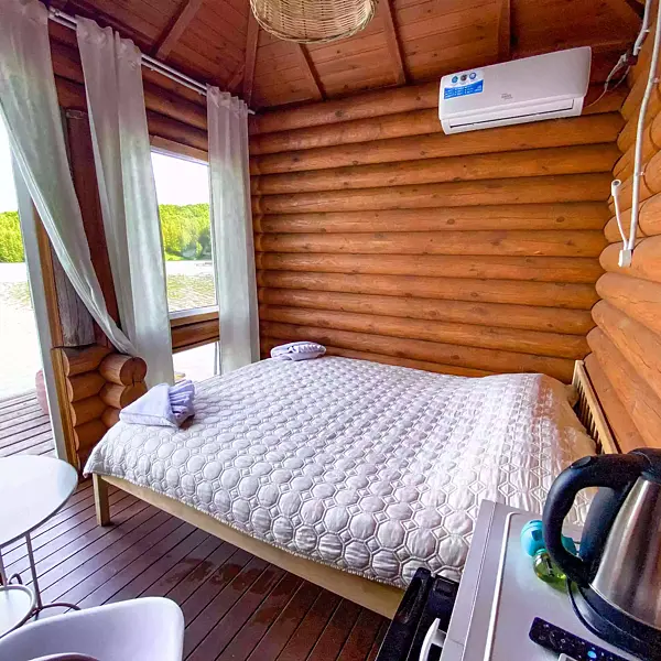 Внутри есть душ, туалет, кондиционер, холодильник, чайник, микроволновка, (тарелки, ложки, вилки, стаканы), двуспальная кровать, двуспальный диван. Находится в приватной зоне. И конечно же, великолепный вид на озеро, своя уютная терраса с зоной для барбекю.