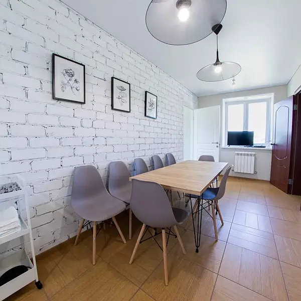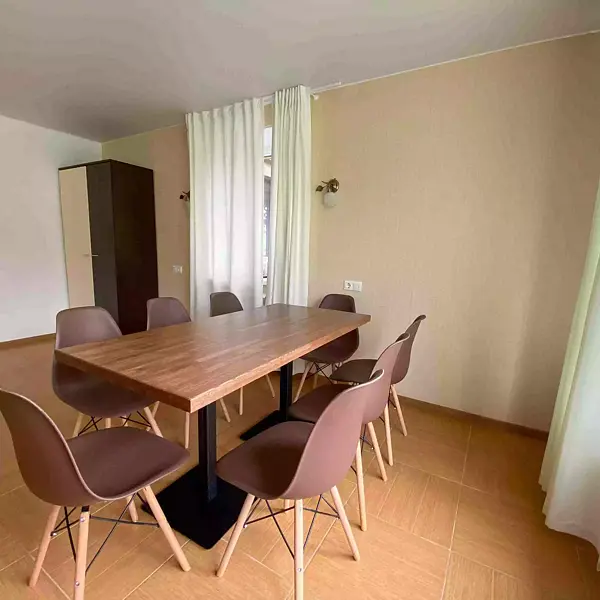 - общая обеденная зона в зале: большой стол и стулья, набор необходимой посуды (тарелки, ложки, вилки, стаканы);