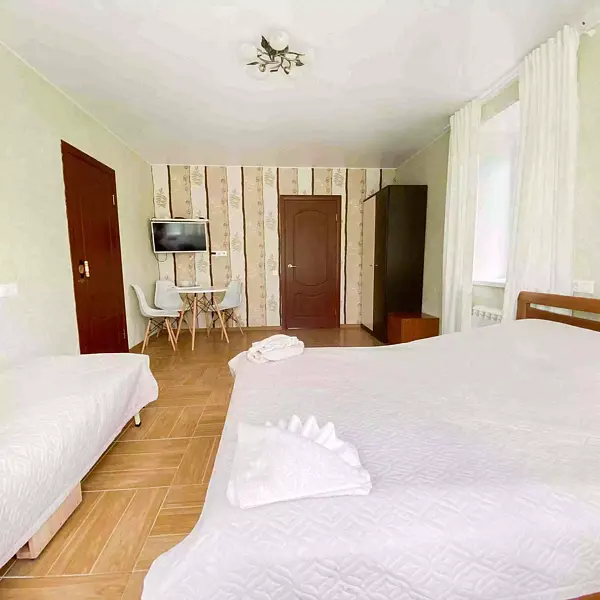 - большая двуспальная кровать, раскладное кресло-кровать, столик со стульями, телевизор; стеллаж;