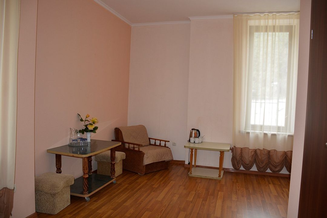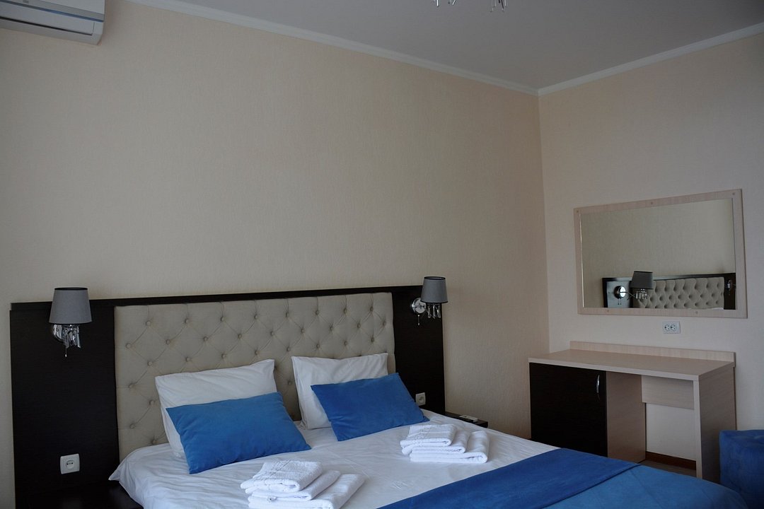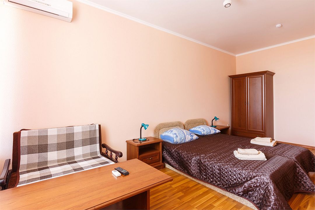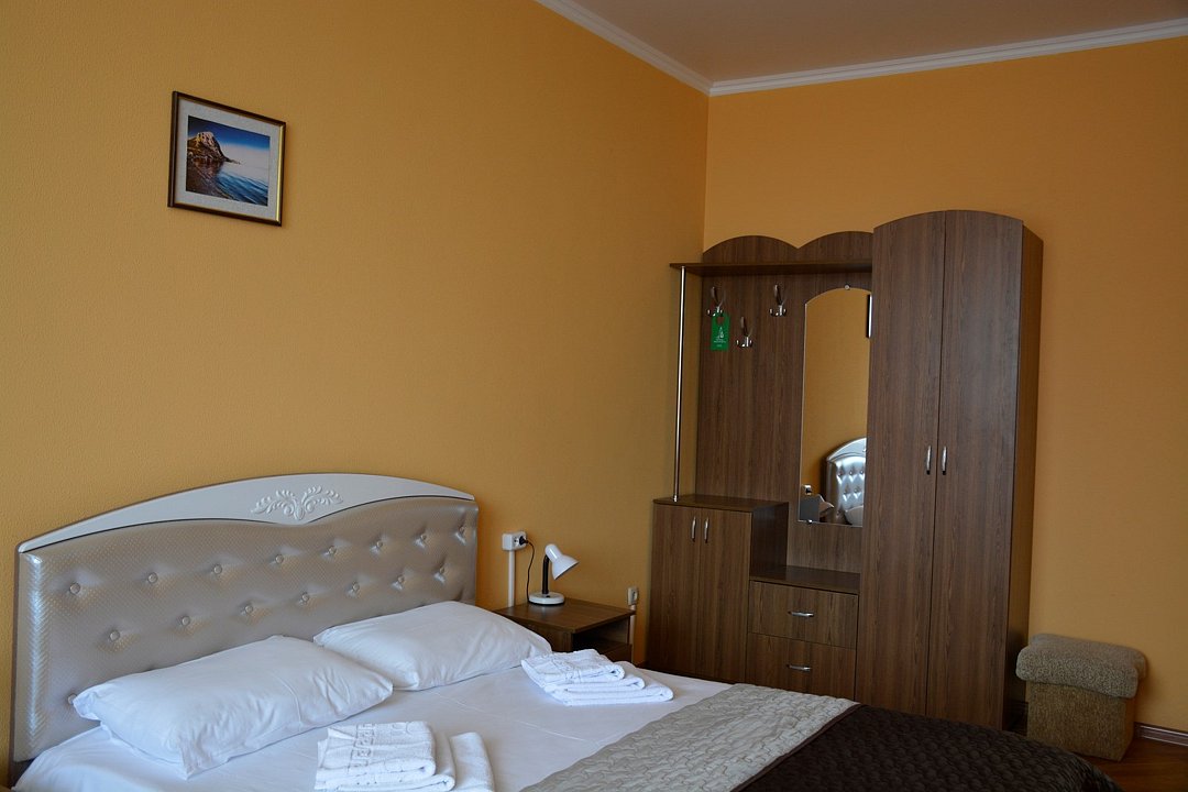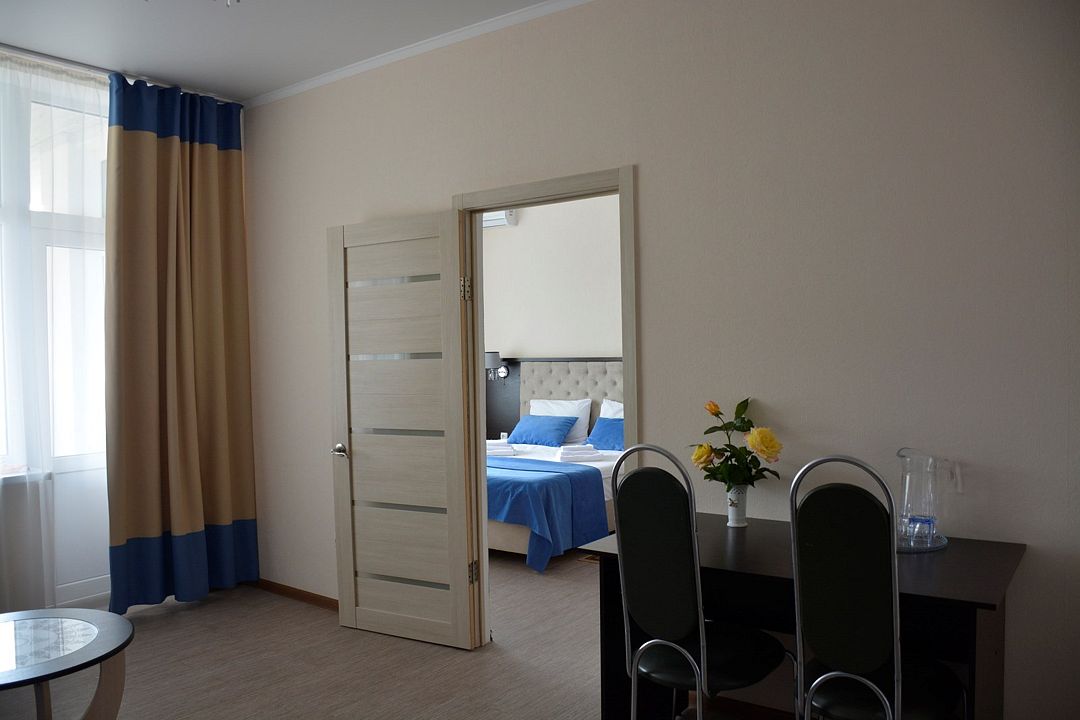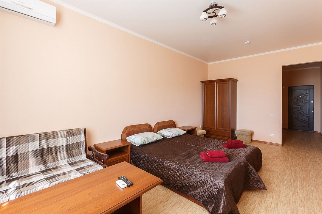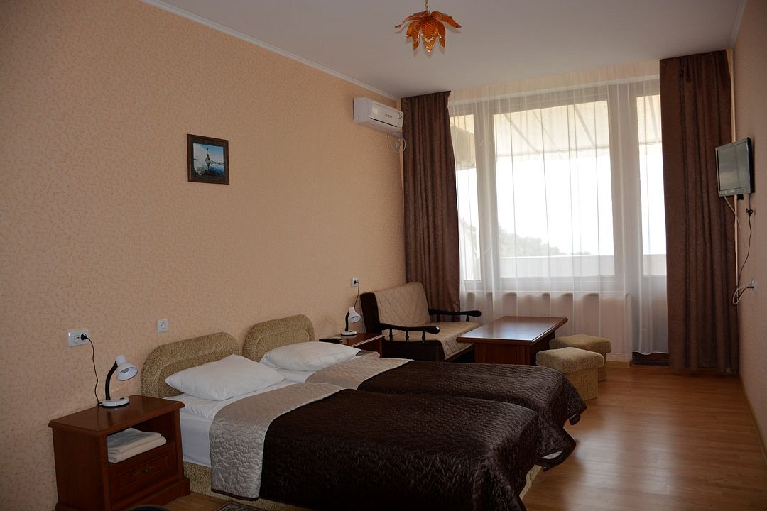 Площадь номера – 44 кв.м. В каждом номере: две односпальные и одна двуспальная кровать, необходимая мебель, телевизор, кондиционер, холодильник; санузел. Номера двухкомнатные, расположены со 2-го по 5-й этаж с видом на море. Выход на балкон из двух комнат. В каждом номере два основных и три дополнительных места.Услуги и удобства