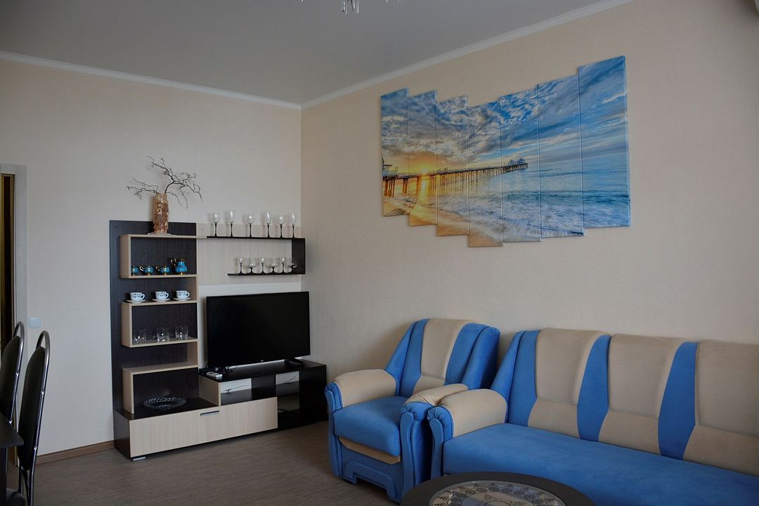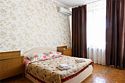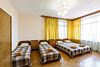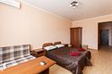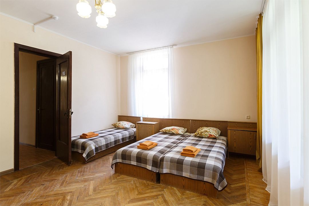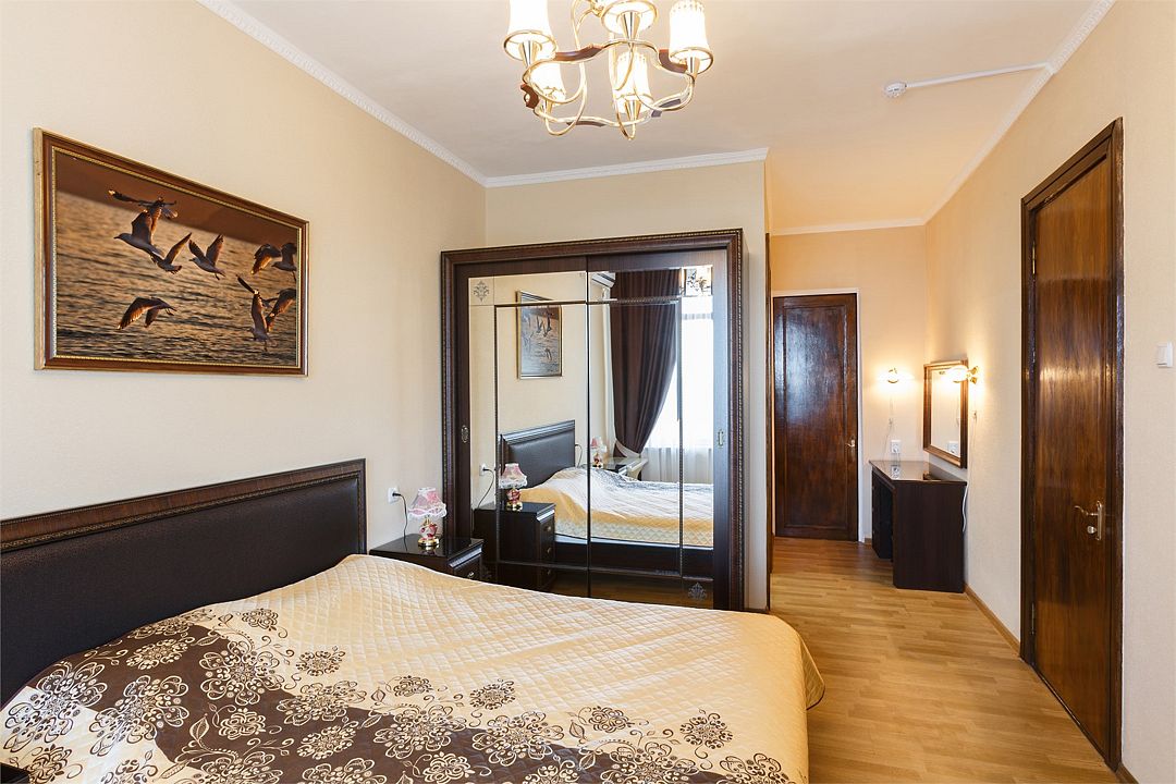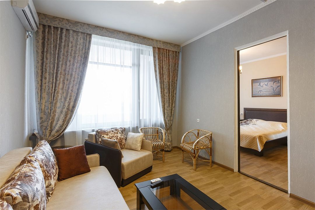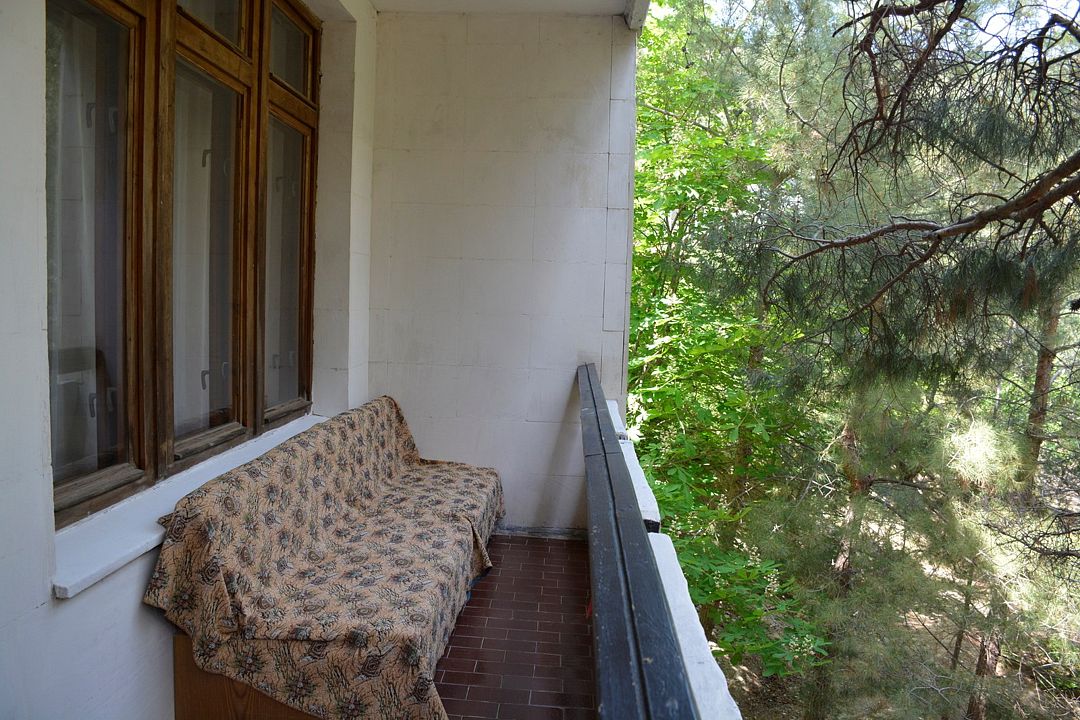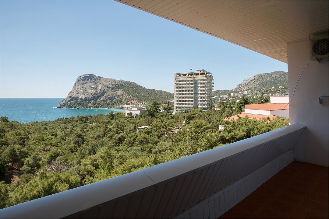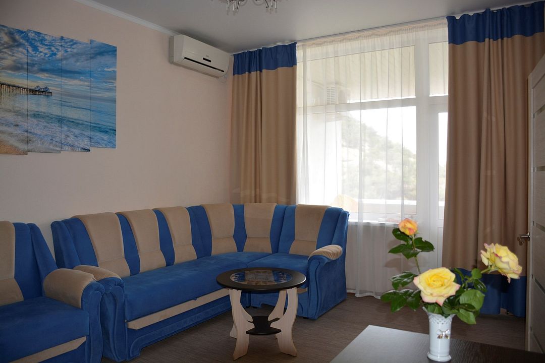 Площадь номера – 44 кв.м. В каждом номере: две односпальные и одна двуспальная кровать, необходимая мебель, телевизор, кондиционер, холодильник; санузел. Номера двухкомнатные, расположены со 2-го по 5-й этаж с видом на море. Выход на балкон из двух комнат. В каждом номере два основных и три дополнительных места.Услуги и удобства