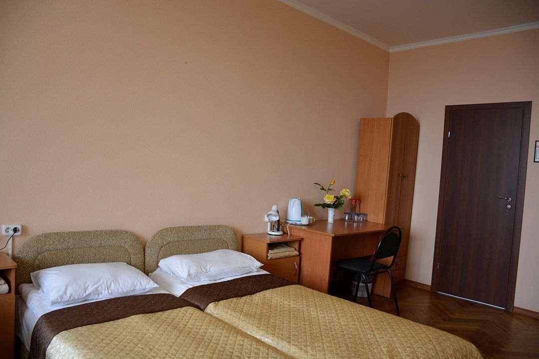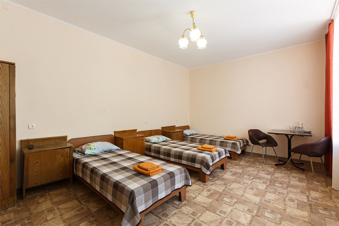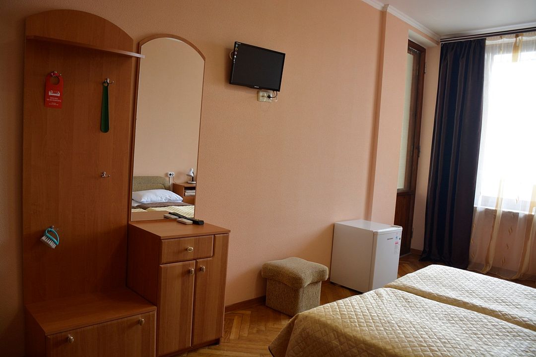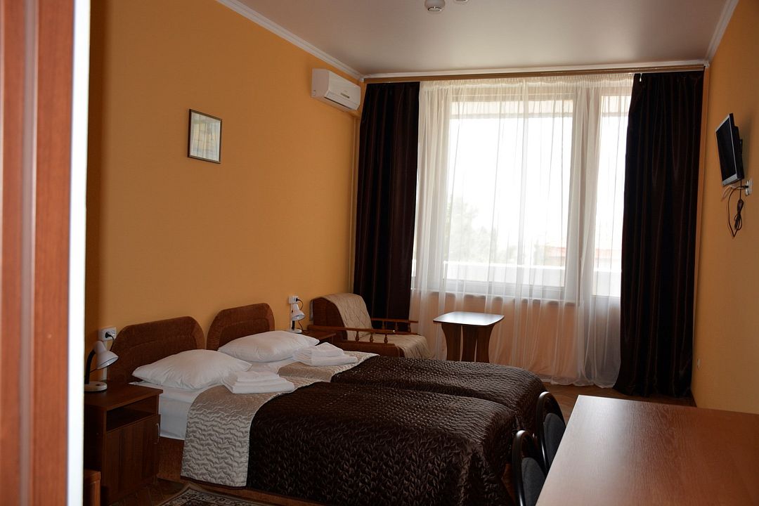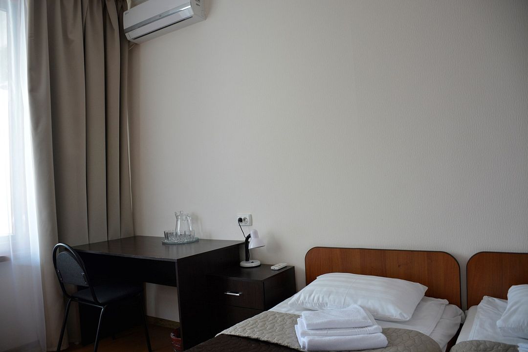 Площадь номера – 22 кв.м В каждом номере: две односпальные кровати, маленький диван или кресло, набор необходимой мебели, телевизор, кондиционер, холодильник; санузел. В номере два основных и одно дополнительное место.Услуги и удобства