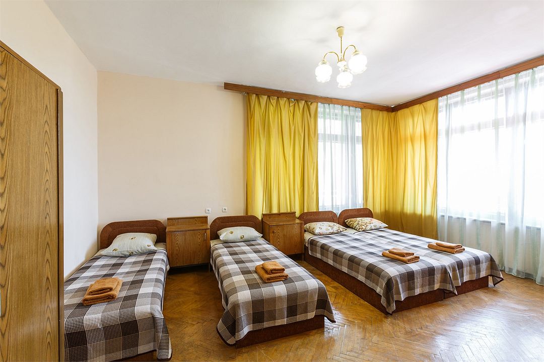 телевизор, кабельное телевидение, Wi-Fi, холодильник, кондиционер, светильник, вентилятор, водонагреватель, стулья, шкаф для одежды, вешалки, набор посуды, чайник, унитаз, раковина, душ, три односпальные кровати, общая ванная комната, стаканы, стол, гостиничная парфюмерия, вид на горыВ гостиничном номере