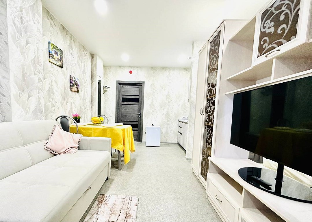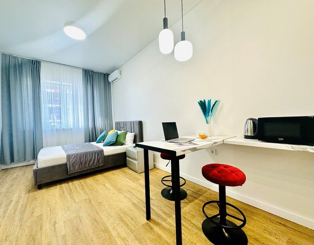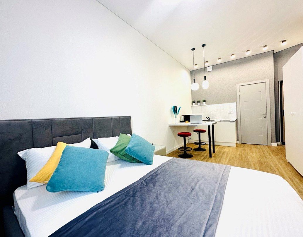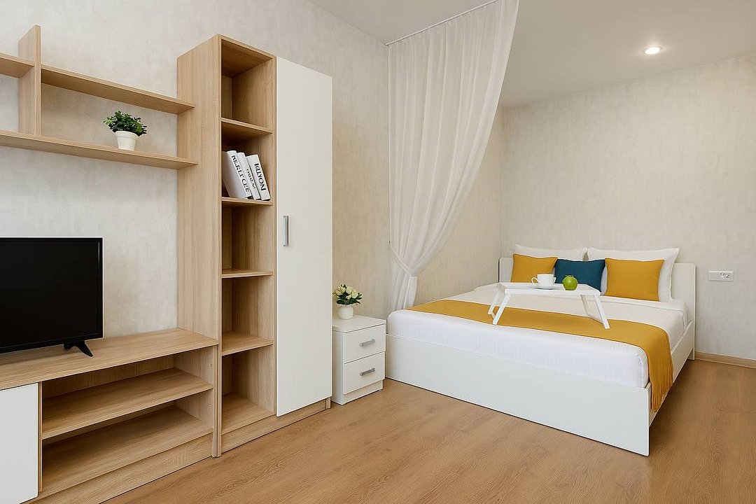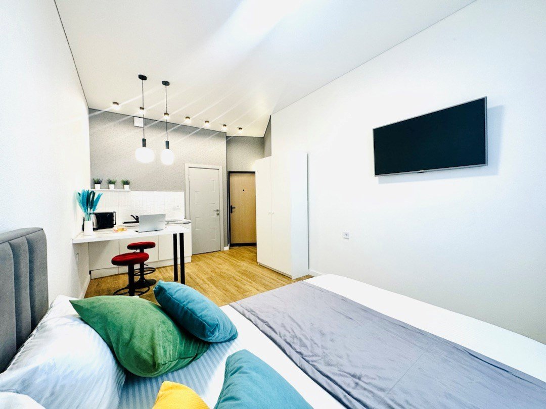 телевизор, кабельное телевидение, Wi-Fi, холодильник, кондиционер, фен, электронные замки, плита для приготовления пищи, микроволновая печь, утюг, ванная комната, душевая кабина, санузел, банные полотенца, гигиенические средства, косметические средства, двуспальная кровать, гладильная доска, стулья, шкаф для одежды, вешалки, обеденный стол, зеркало, кухня, чайный набор, набор посуды, стиральная машина, чайник, унитаз, раковина, косметическое зеркало, обеденная зона, отопление, вид на город, ламинат, кухонная посуда, стаканы, кухонная утварь, столовые приборы, туалетные средства, туалет, сушилка для белья, цифровое тв, телевизор с плоским экраном, кухонный уголок, телевизор со Smart TV, номер для некурящих, онлайн-регистрация до заезда, набор для приготовления чая и кофе, мини-бар (платно), онлайн-регистрация, можно с питомцамиВ студии