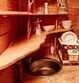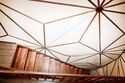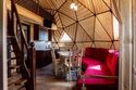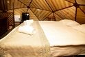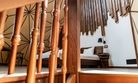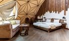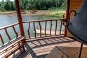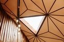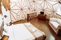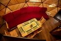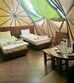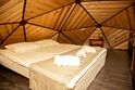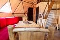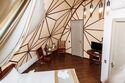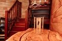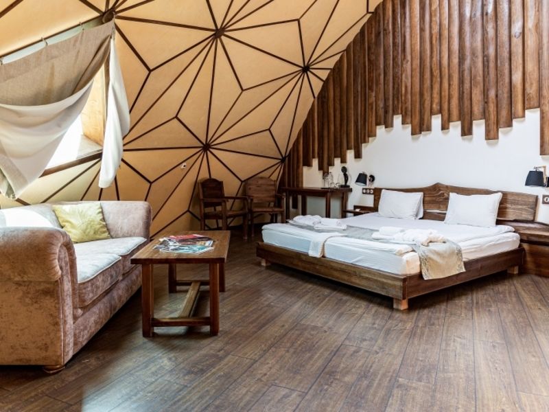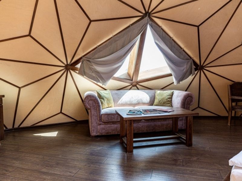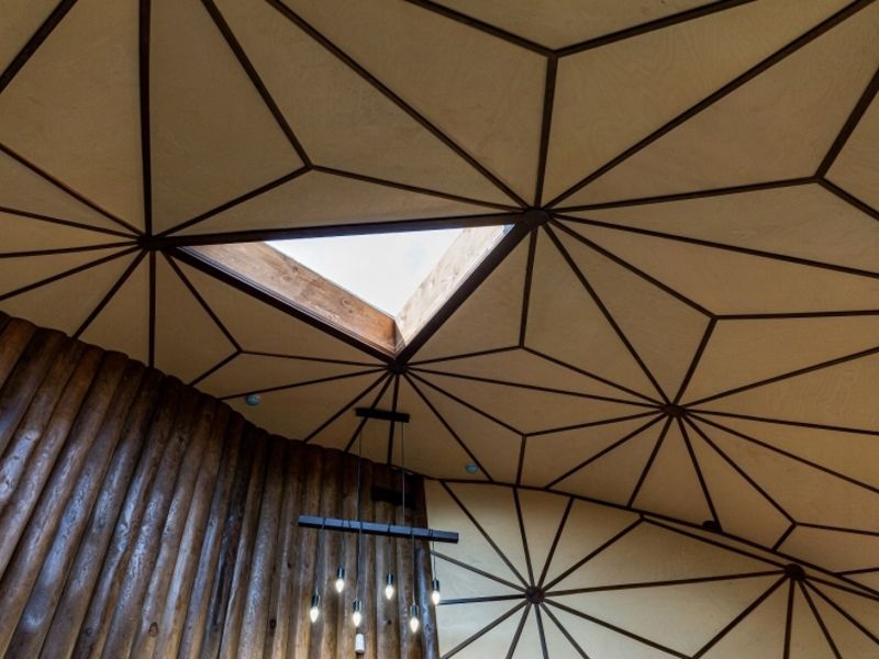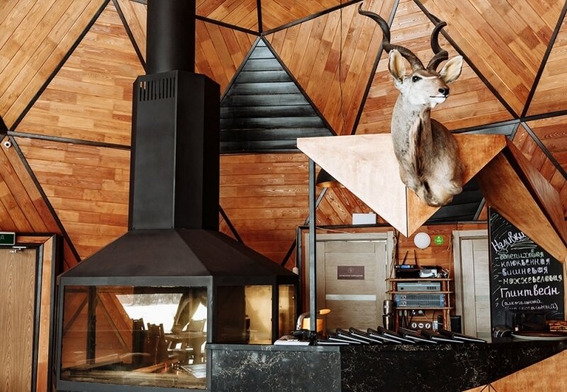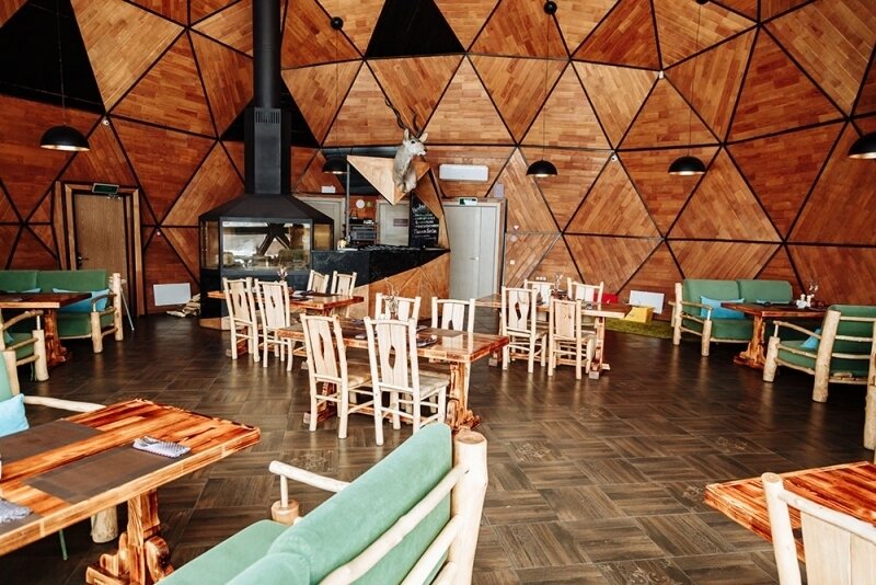 Интерьер сочетает в себе мебель из массива дерева, панорамные окна с деревянными балками, глиняную посуду, текстиль. Каждая деталь создает тон всему интерьеру и выигрышно смотрится в просторном зале ресторана под деревянным куполом.