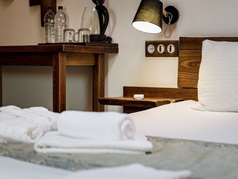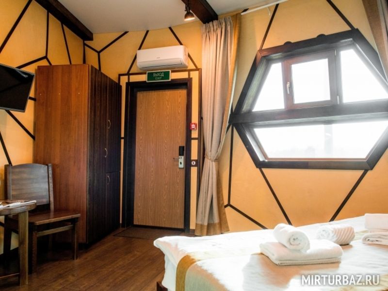 Номер в отеле с двуспальными и односпальными кроватями на ваш выбор. В номерах предоставлены: полотенца, халаты, тапочки, средства личной гигиены. В номере имеется чайный набор, ключевая вода.