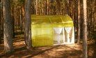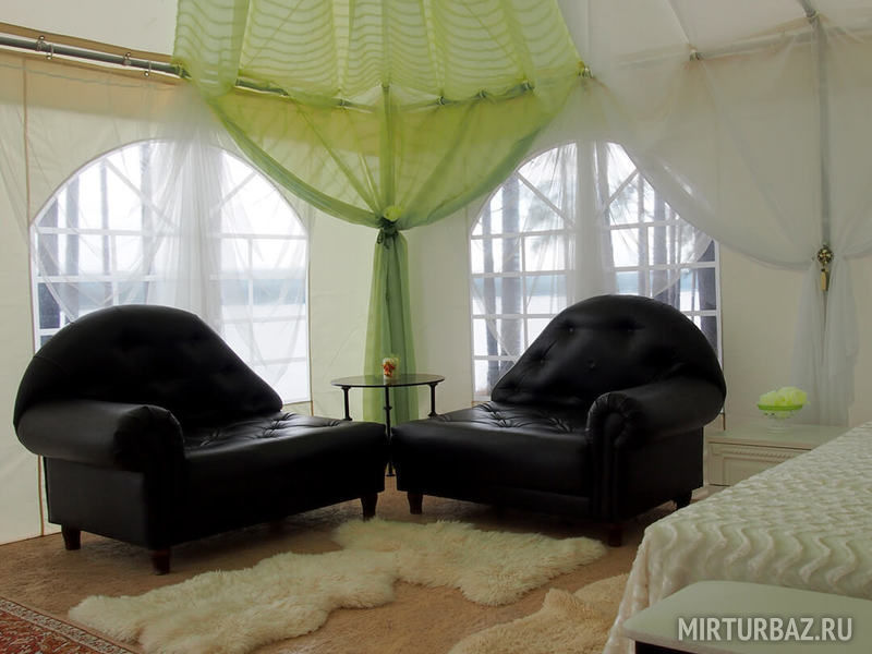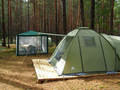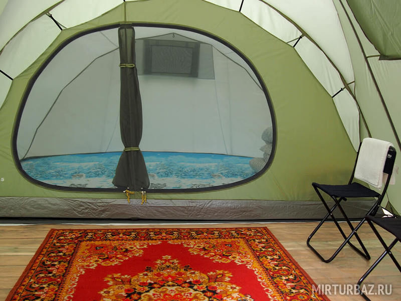 В "холле" кемпинговой палатки можно стоять в полный рост. Есть столик, стулья, электричество, свет. В спальном отделении размером 2,5х3 метра могут разместиться до 5 человек.