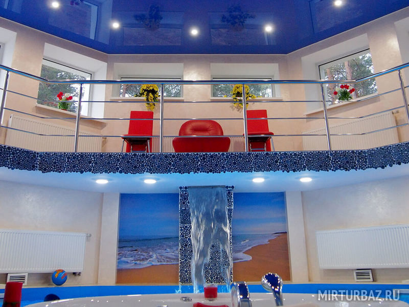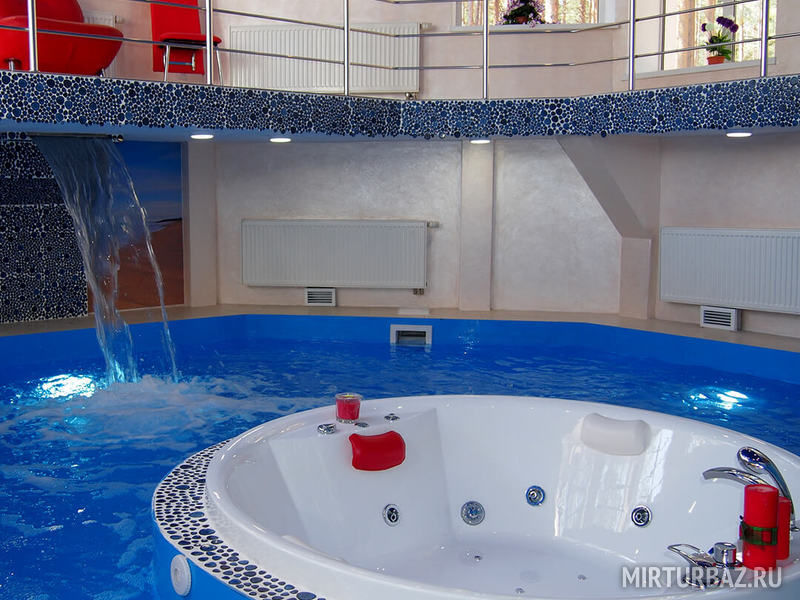 Гостей базы отдыха ждёт роскошный бассейн с джакузи, водопадом и мультимедийным сопровождением, дровяной сауной и большой комнатой отдыха. Минерализованная артезианская вода бассейна оказывает благотворное влияние на сердечно-сосудистой систему.