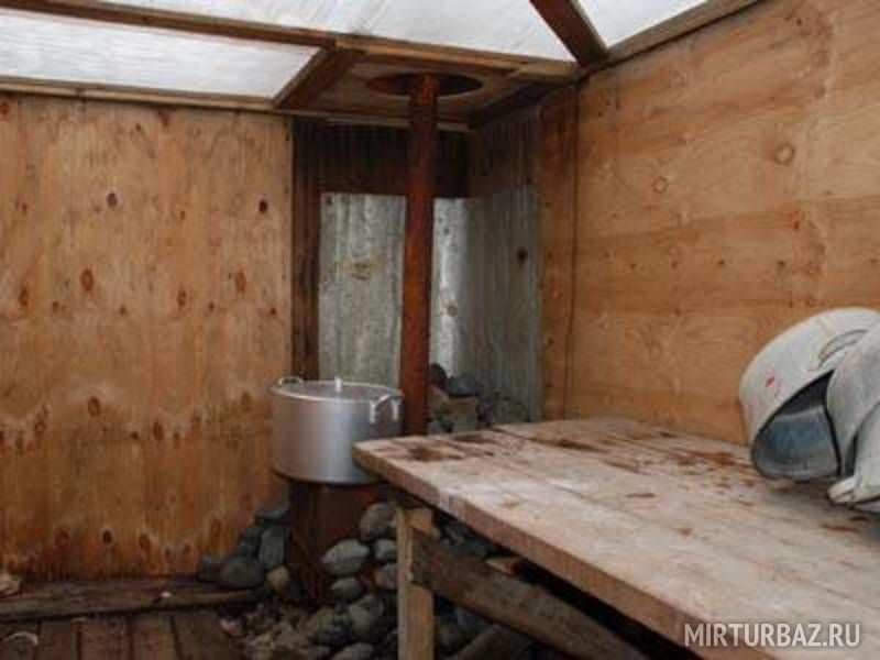 Сборно-щитовя баня с парной. Здесь можно просто помыться или основательно попариться с веничком. В нескольких шагах от входа - огромный "бассейн" с прохладной морской водой.