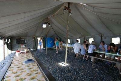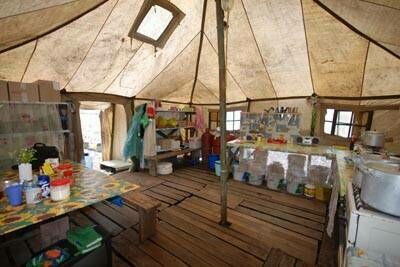 В большой армейской палатке площадью около 50 квадратных метров оборудована Кают - кампания. Рядом с ней - тент от солнца.