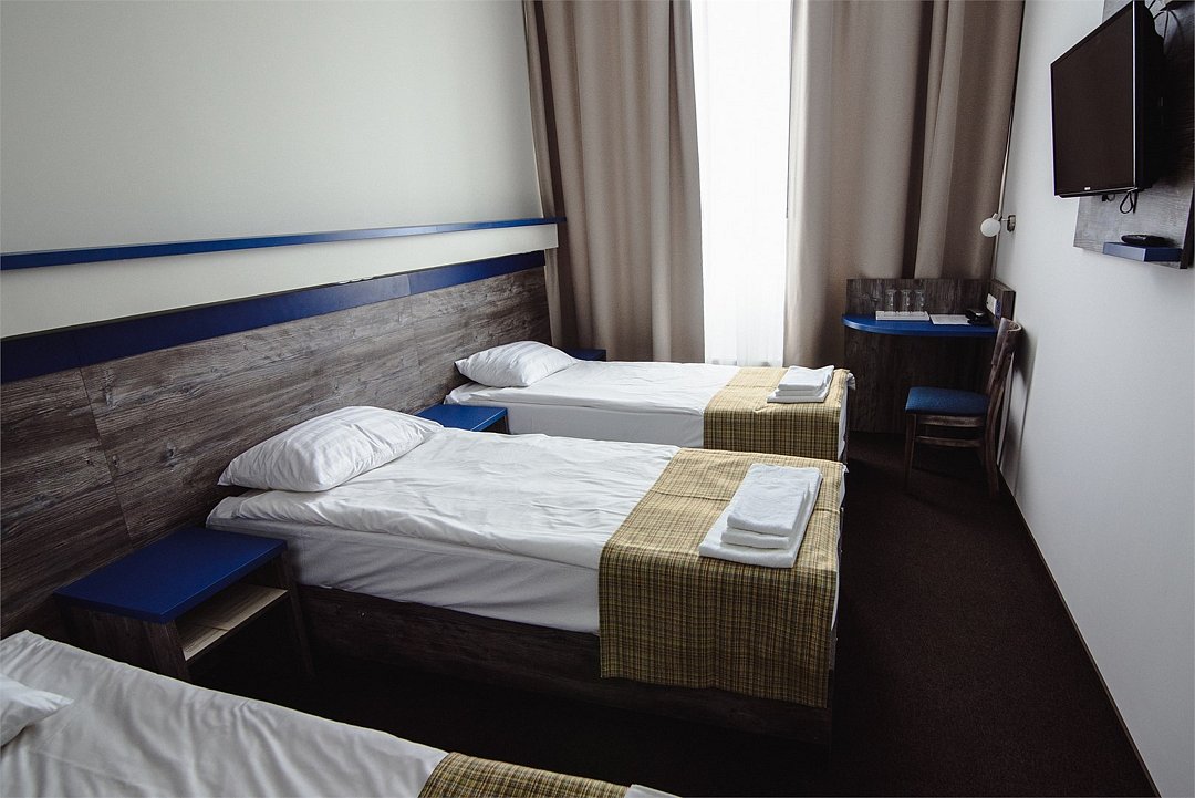 телевизор, Wi-Fi, телефон, электронные замки, душ, кулер на этаже, три односпальные кроватиВ гостиничном номере