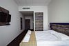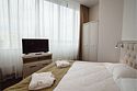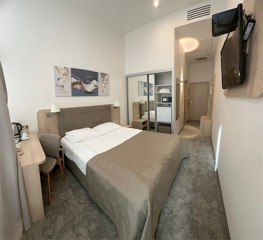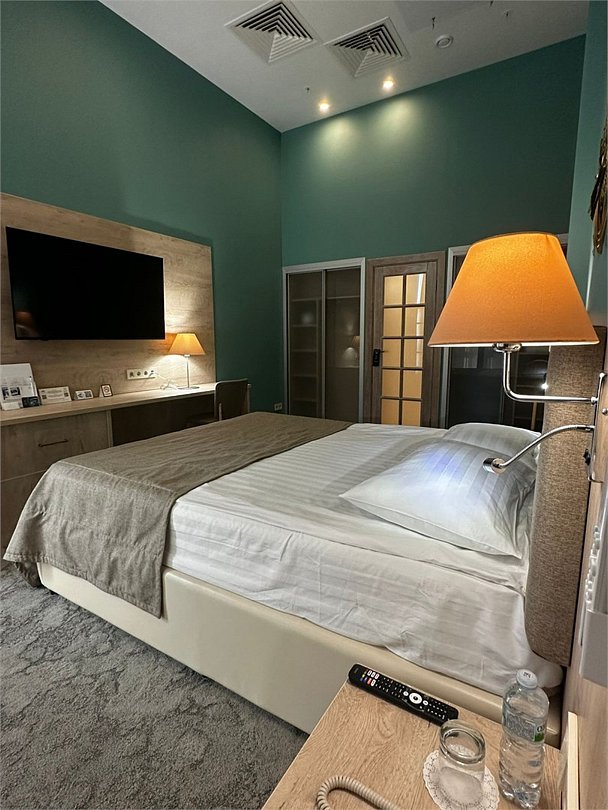 телевизор, Wi-Fi, интернет, телефон, система климат-контроля, настольные лампы, фен, электронные замки, душевая кабина, санузел, халаты, банные полотенца, тапочки, две односпальные или большая двуспальная кровать, шкаф для одежды, вешалки, письменный стол, багажная тумба, зеркало, мини-бар, письменные принадлежности, чайный набор, косметическое зеркало, питьевая водаВ гостиничном номере