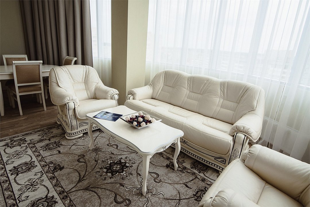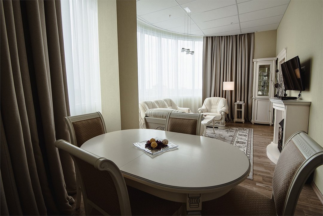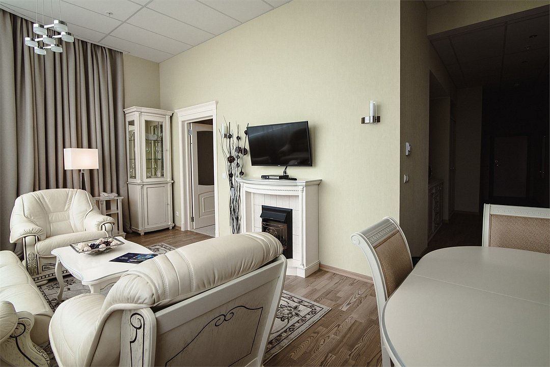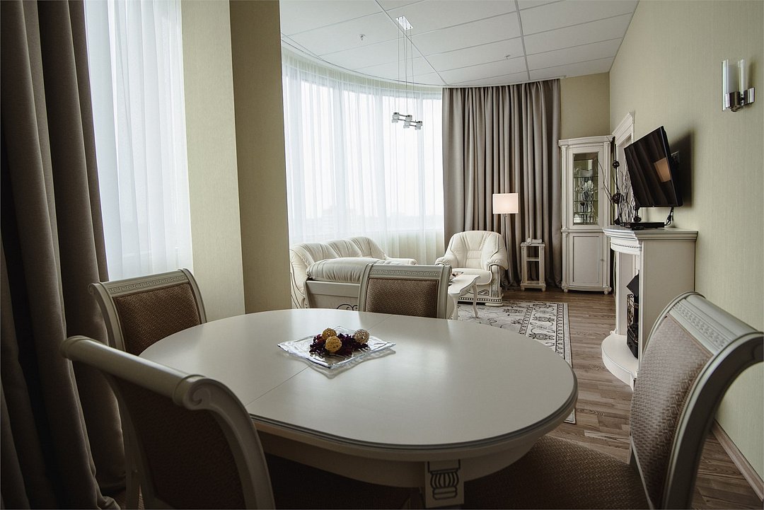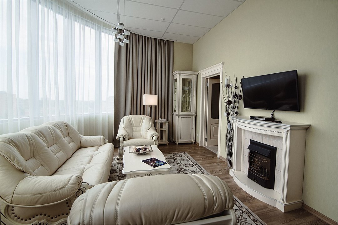 два телевизора, Wi-Fi, телефон, система климат-контроля, настольные лампы, фен, электронные замки, душевая кабина, санузел, дополнительный санузел, халаты, банные полотенца, тапочки, двуспальная кровать, диван, стулья, шкаф для одежды, письменный стол, багажная тумба, зеркало, две комнаты, мини-бар, письменные принадлежности, косметическое зеркало, питьевая вода, гостиная зона, отоплениеВ гостиничном номере