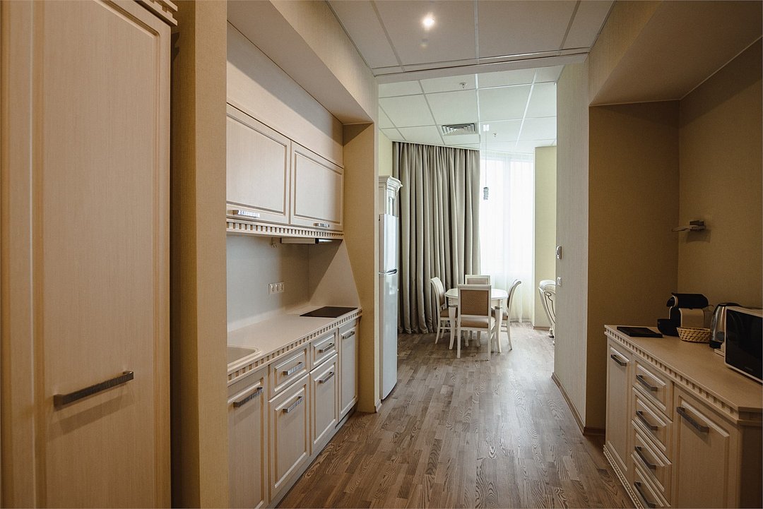 два телевизора, Wi-Fi, телефон, холодильник, электронные замки, плита для приготовления пищи, микроволновая печь, ванна, халаты, косметические средства, двуспальная кровать, кухня, набор посудыВ гостиничном номере