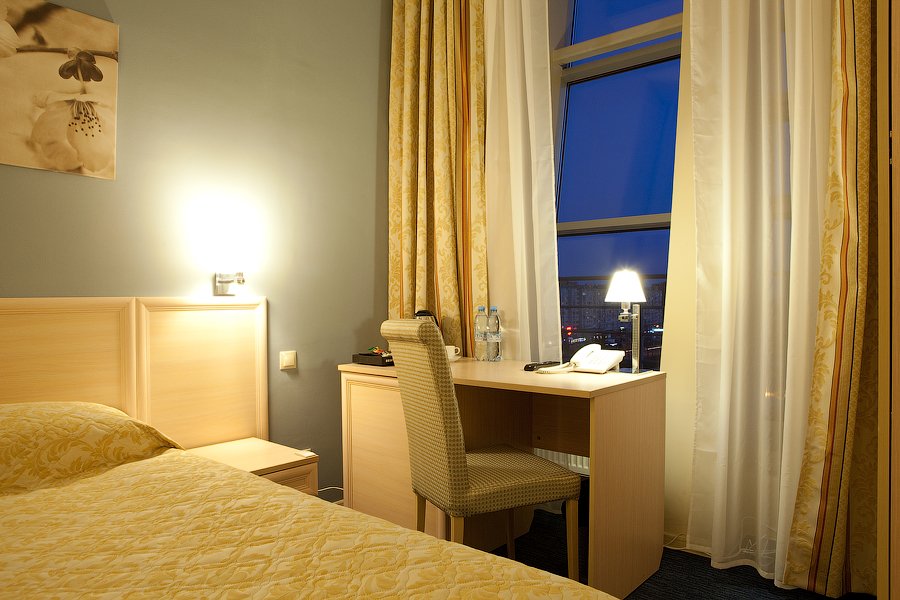 телевизор, Wi-Fi, телефон, система климат-контроля, настольные лампы, фен, электронные замки, душевая кабина, санузел, халаты, банные полотенца, тапочки, две односпальные или большая двуспальная кровать, стулья, шкаф для одежды, вешалки, письменный стол, багажная тумба, зеркало, мини-бар, письменные принадлежности, косметическое зеркало, питьевая вода, отопление, вид на городВ гостиничном номере