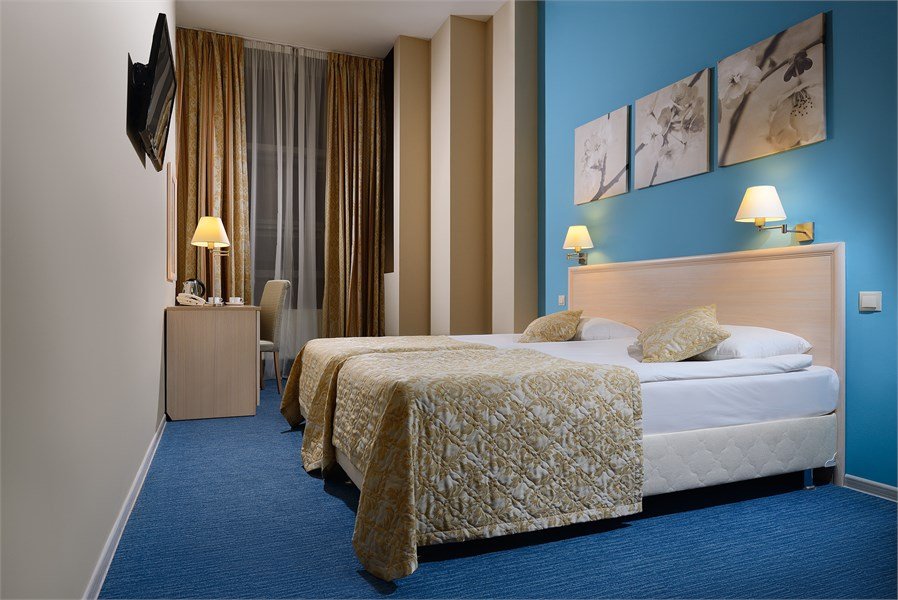 телевизор, Wi-Fi, интернет, телефон, система климат-контроля, настольные лампы, фен, электронные замки, душевая кабина, санузел, халаты, банные полотенца, тапочки, две односпальные или большая двуспальная кровать, шкаф для одежды, письменный стол, багажная тумба, зеркало, мини-бар, письменные принадлежности, чайный набор, косметическое зеркало, питьевая водаВ гостиничном номере