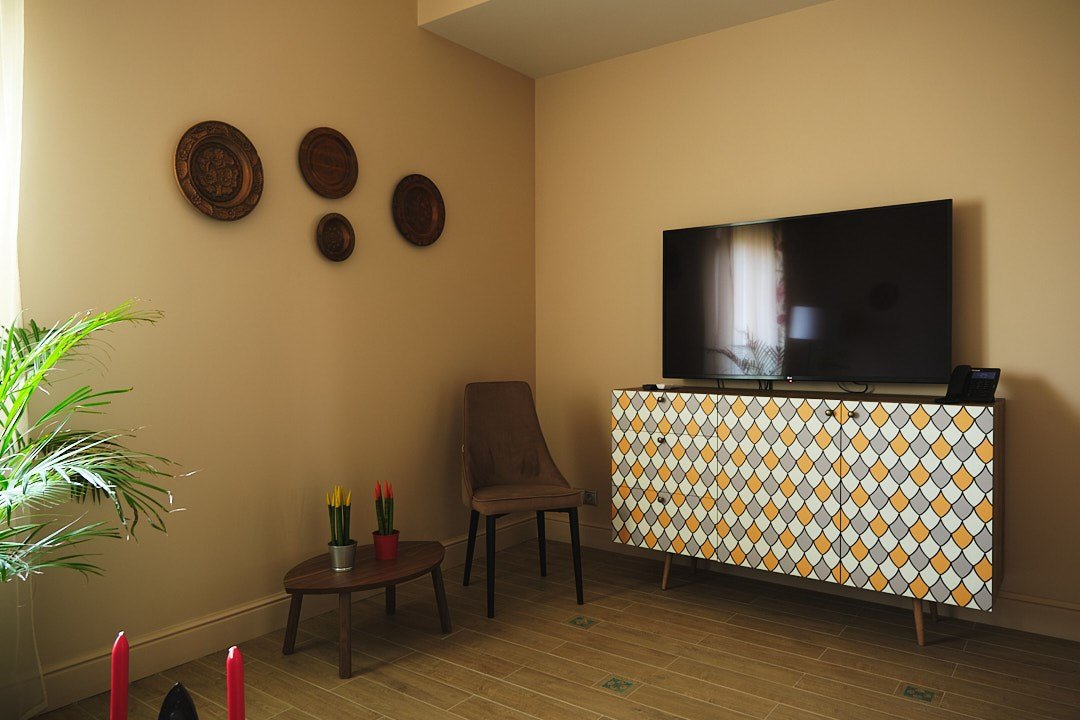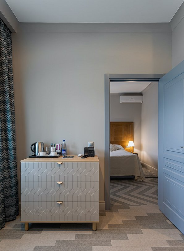 спутниковое телевидение, Wi-Fi, кондиционер, светильник, настольные лампы, фен, электронные замки, утюг, ванная комната, душевая кабина, банные принадлежности, халаты, банные полотенца, тапочки, гигиенические средства, косметические средства, две односпальные или большая двуспальная кровать, гладильная доска, стулья, шкаф для одежды, вешалки, журнальный столик, обеденный стол, зеркало, комод, эксклюзивная мебель, две комнаты, чайный набор, обслуживание номеров, информационная карта, меню, сейф, чайник, унитаз, питьевая вода, гостиная зона, отопление, кресло, вид во двор, стаканы, туалетный столик, кофейный столик, стул, туалетные средства, туалет, раскладное кресло, внутренний телефон, телевизор с плоским экраном, мини-холодильник, москитная сетка, холодильный шкаф, кресло-кровать, чайная станцияВ гостиничном номере