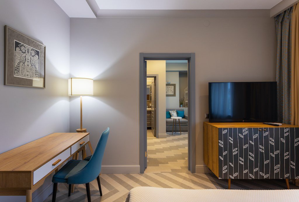 спутниковое телевидение, Wi-Fi, холодильник, кондиционер, светильник, настольные лампы, фен, утюг, ванна или душевая кабина, банные принадлежности, халаты, банные полотенца, тапочки, косметические средства, терраса, две односпальные или большая двуспальная кровать, гладильная доска, стулья, шкаф для одежды, гардеробная, вешалки, обеденный стол, багажная тумба, зеркало, комод, эксклюзивная мебель, набор посуды, минеральная вода, стиральная машина, мягкая мебель, обеденная зона, гостиная зона, ковровое покрытие, три комнаты, плиточное покрытие, кресло, раздельный санузел, высокие потолки, стаканы, туалетный столик, кофейный столик, туалетные средства, панорамные окна, диван-кровать, раскладной диван, внутренний телефон, телевизор с плоским экраном, гостиничная парфюмерия, номер для некурящих, электронный консьерж 24/7, чайная станцияВ гостиничном номере