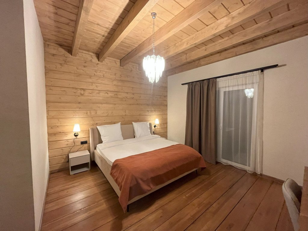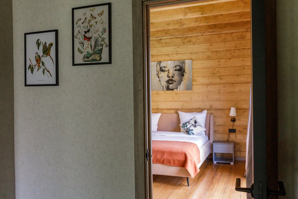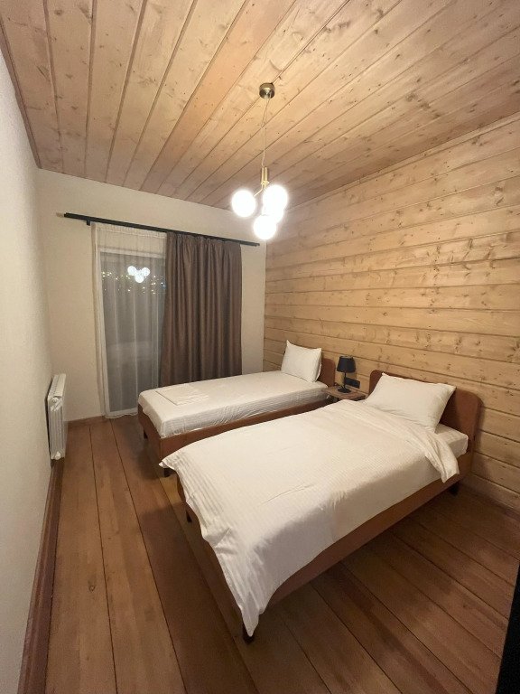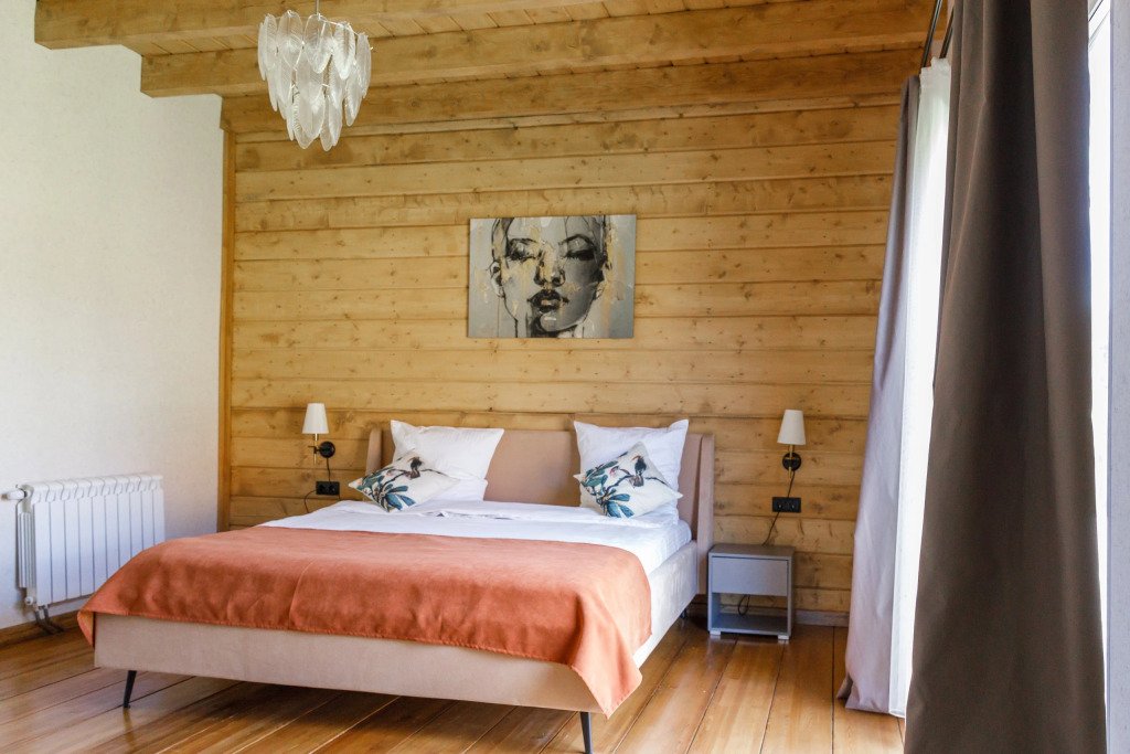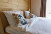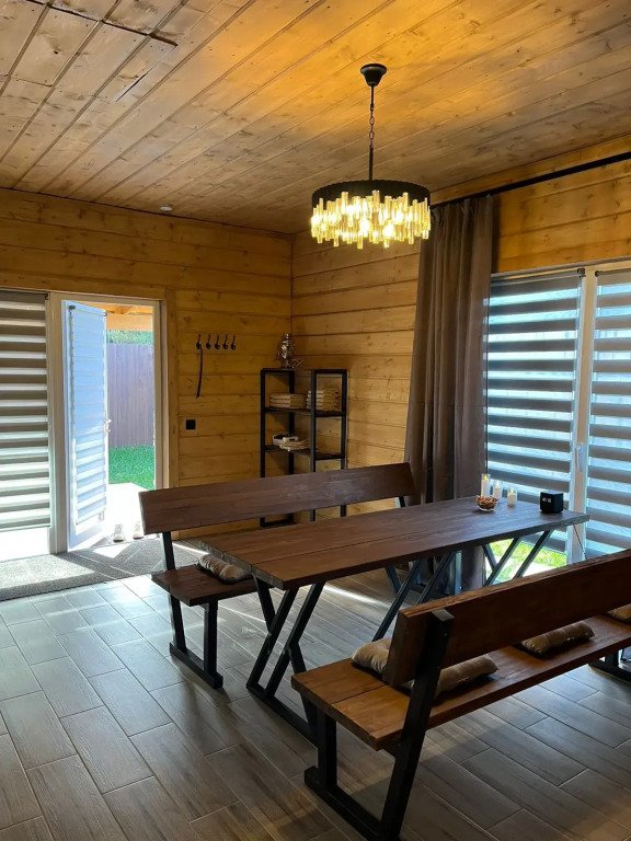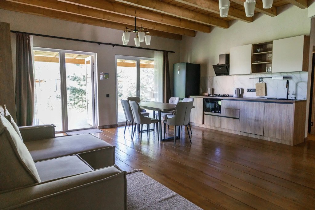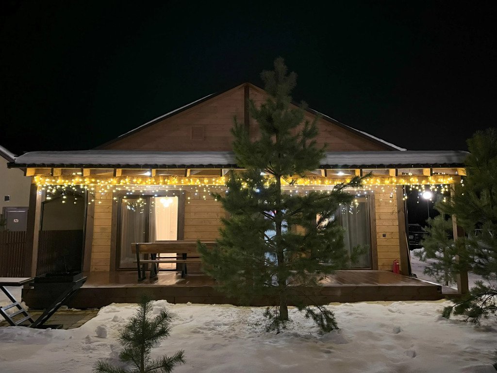 Дом подходит для проживания 1-8 человек. Из спальных мест: две двуспальные кровати 180x200 см с ортопедическим матрасом, две односпальные кровати 90x200 см и диван-кровать.