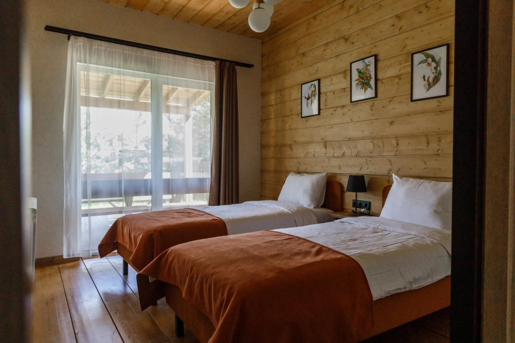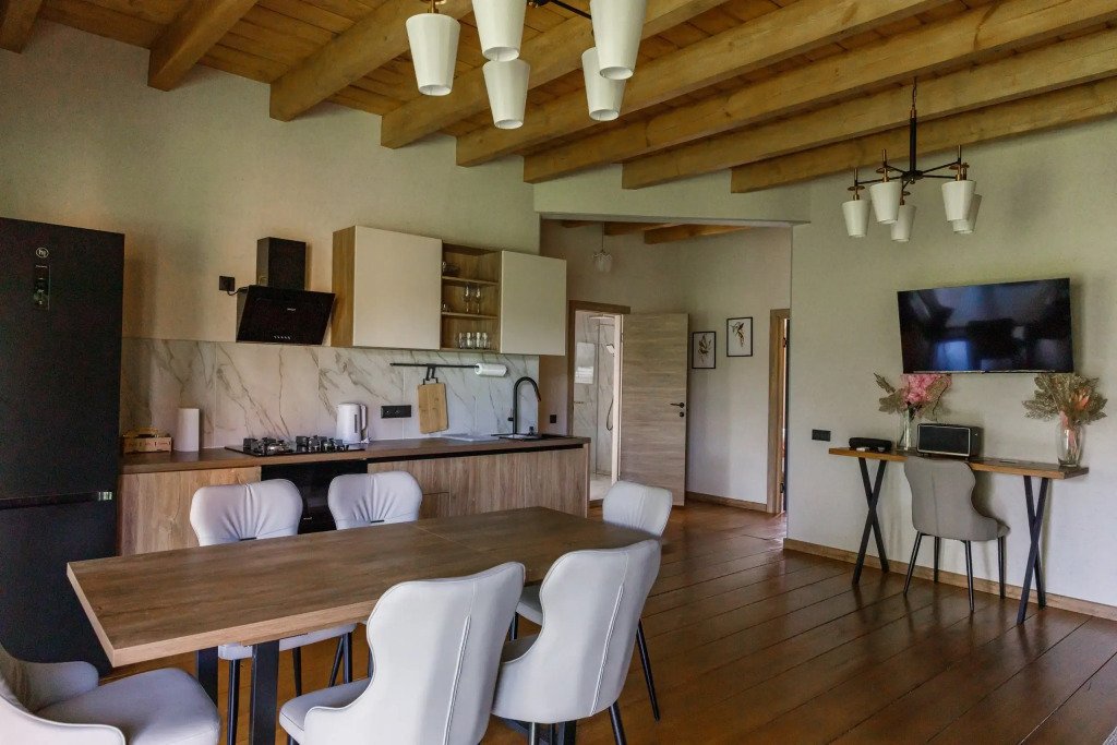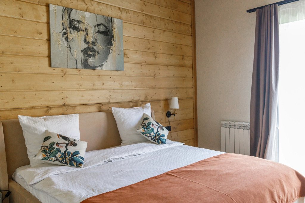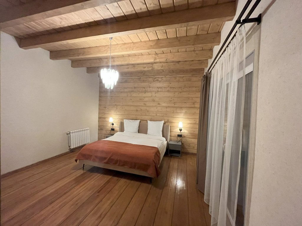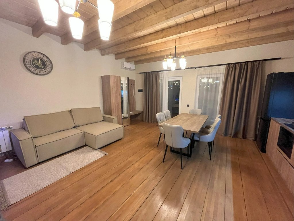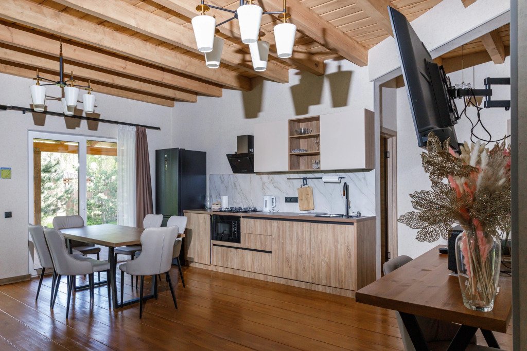 Дом подходит для проживания 1-8 человек. Из спальных мест: две двуспальные кровати 180x200 см с ортопедическим матрасом, две односпальные кровати 90x200 см и диван-кровать.