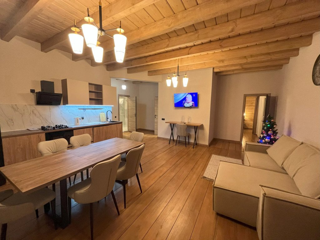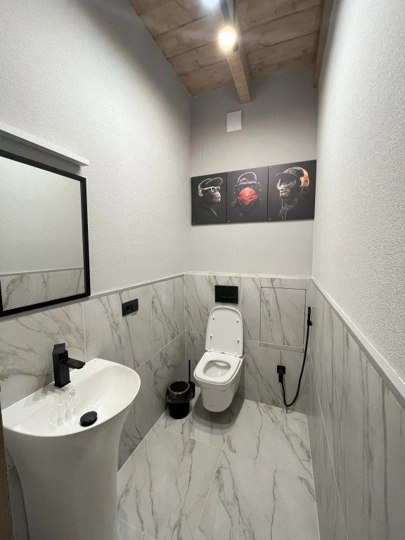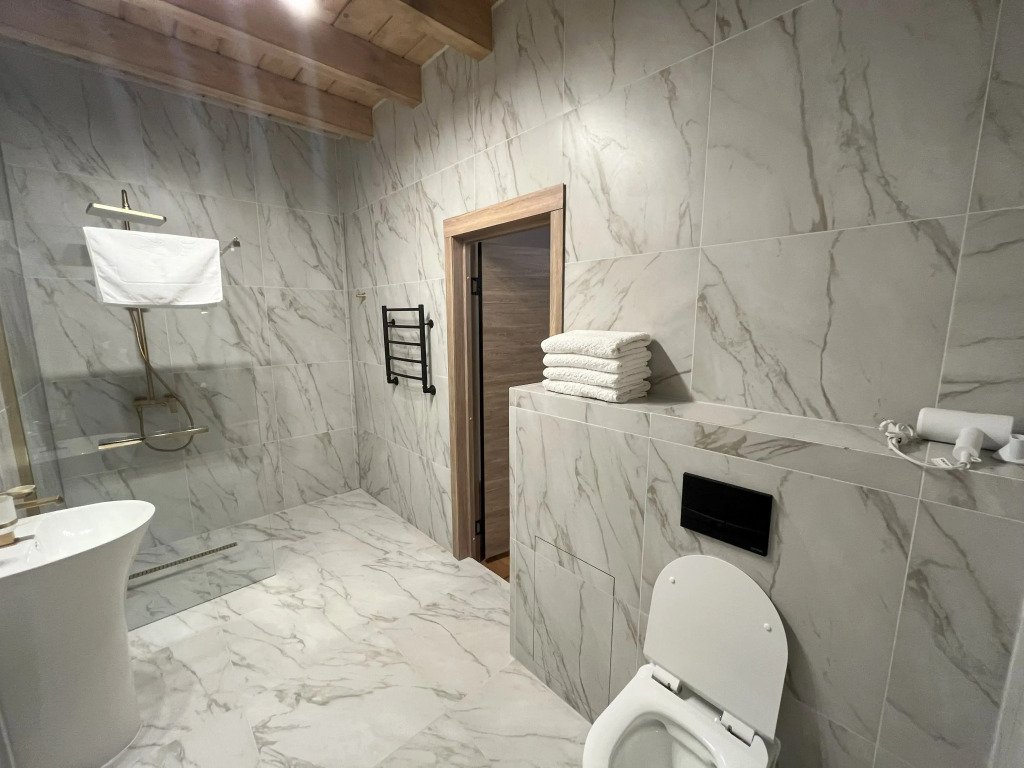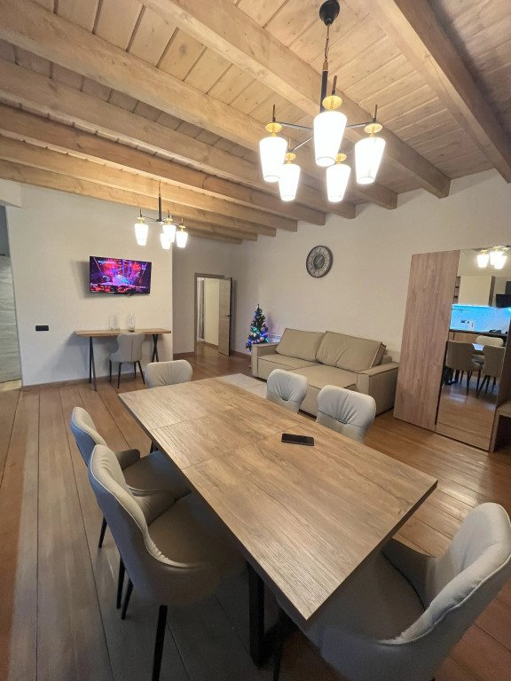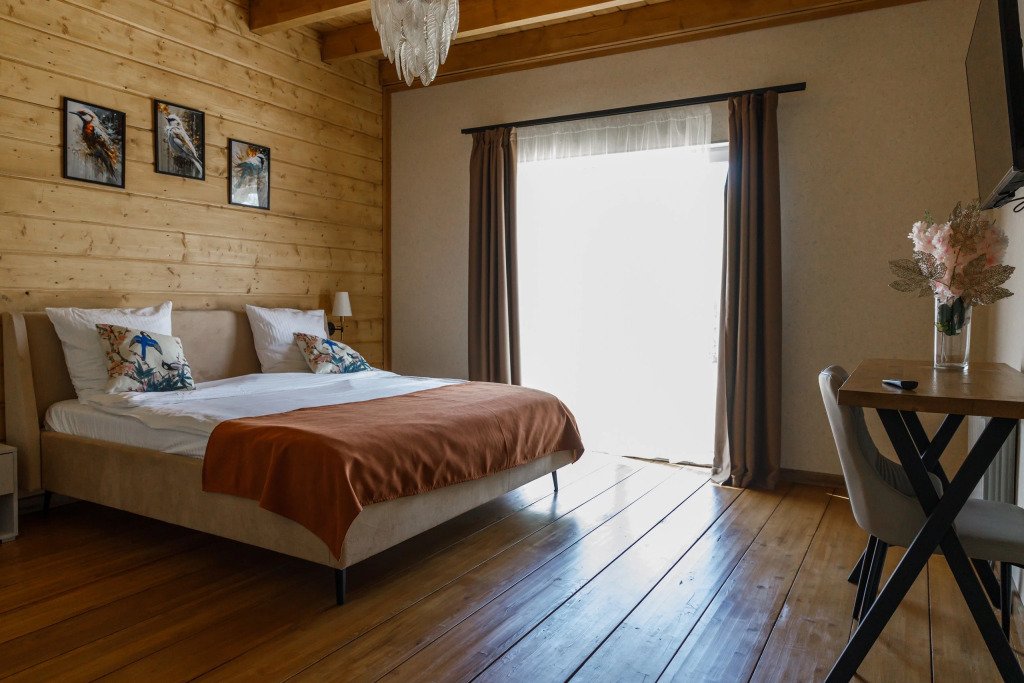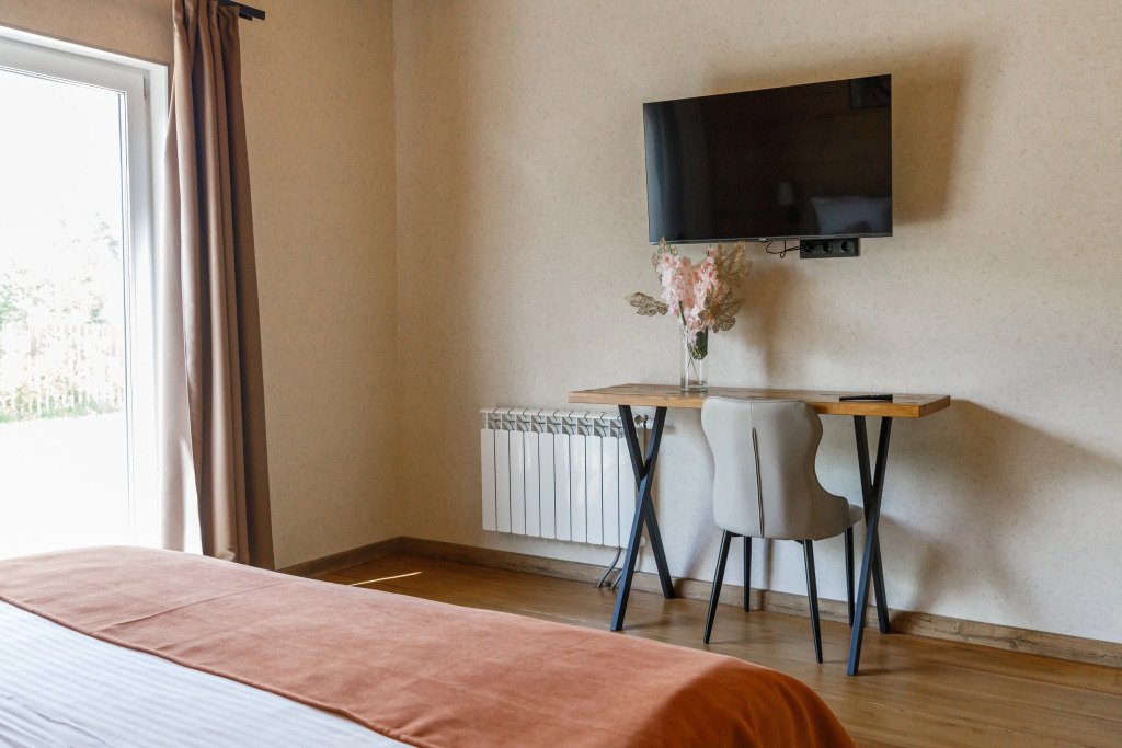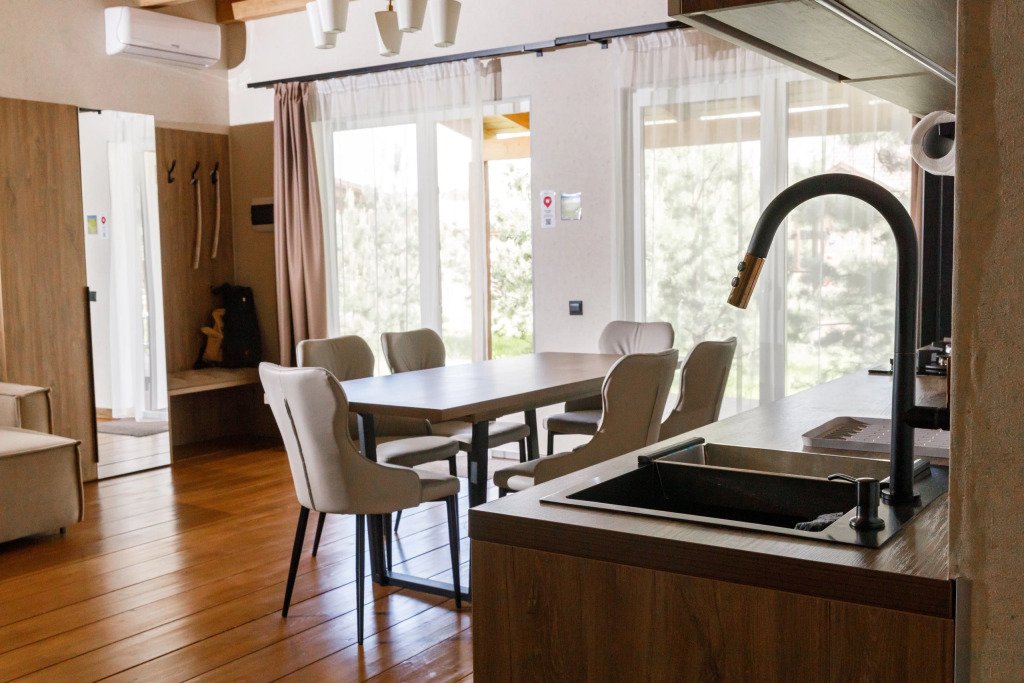 Дом подходит для проживания 1-8 человек. Из спальных мест: две двуспальные кровати 180x200 см с ортопедическим матрасом, две односпальные кровати 90x200 см и диван-кровать.