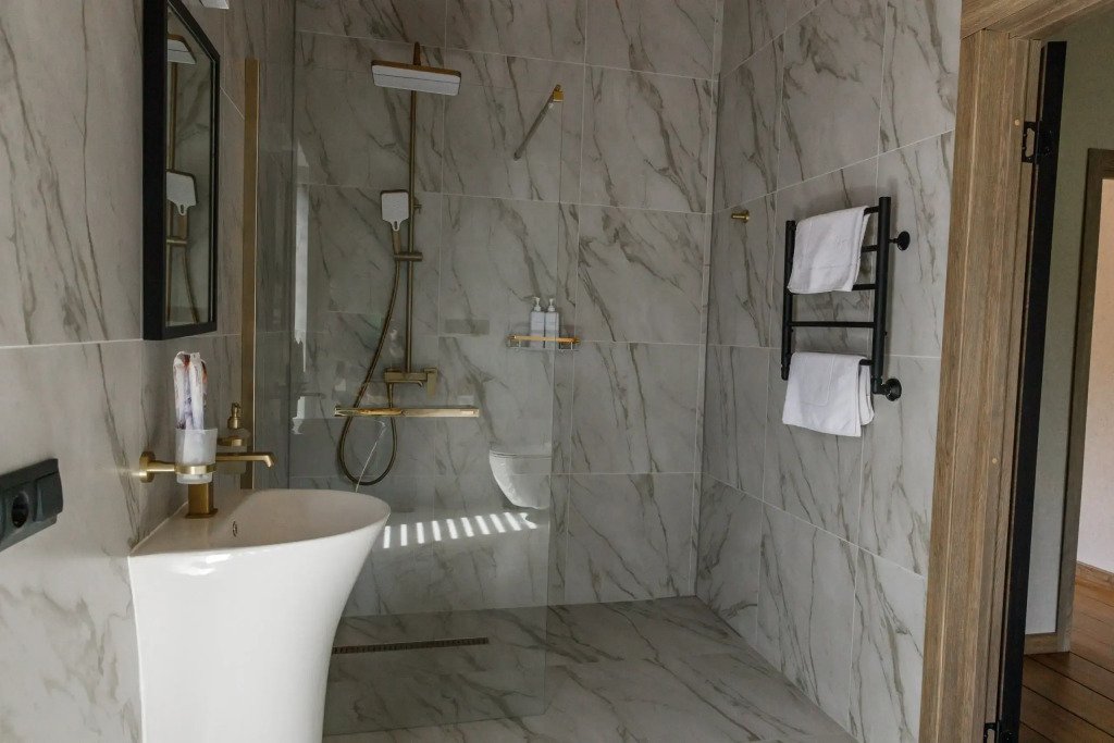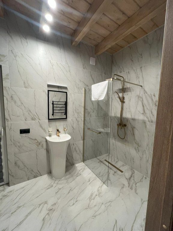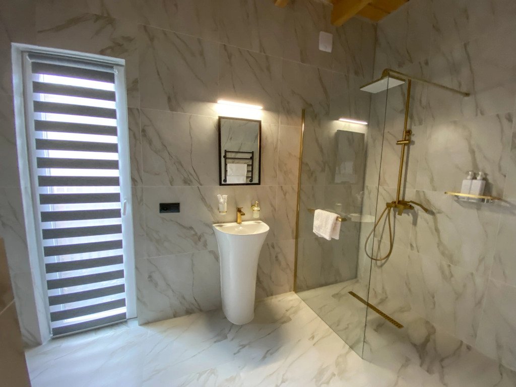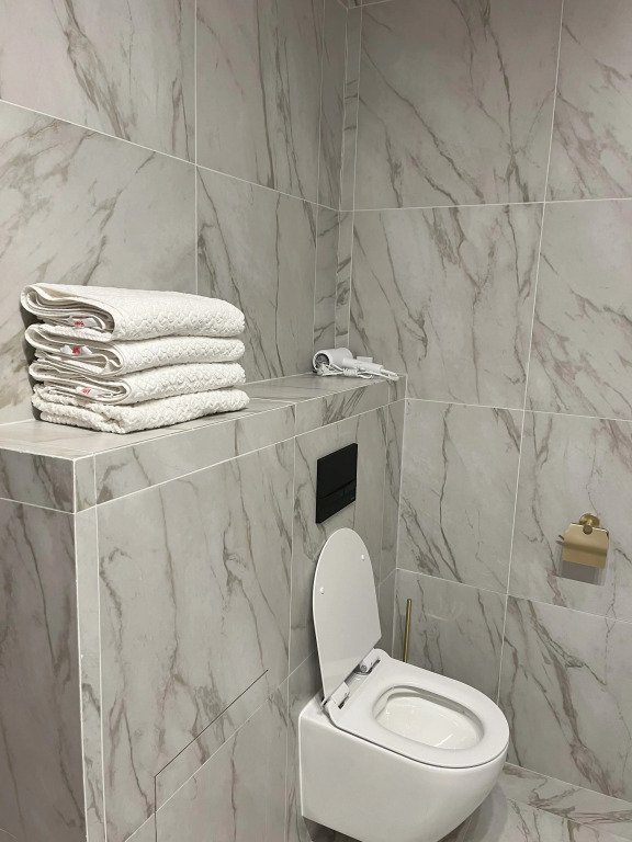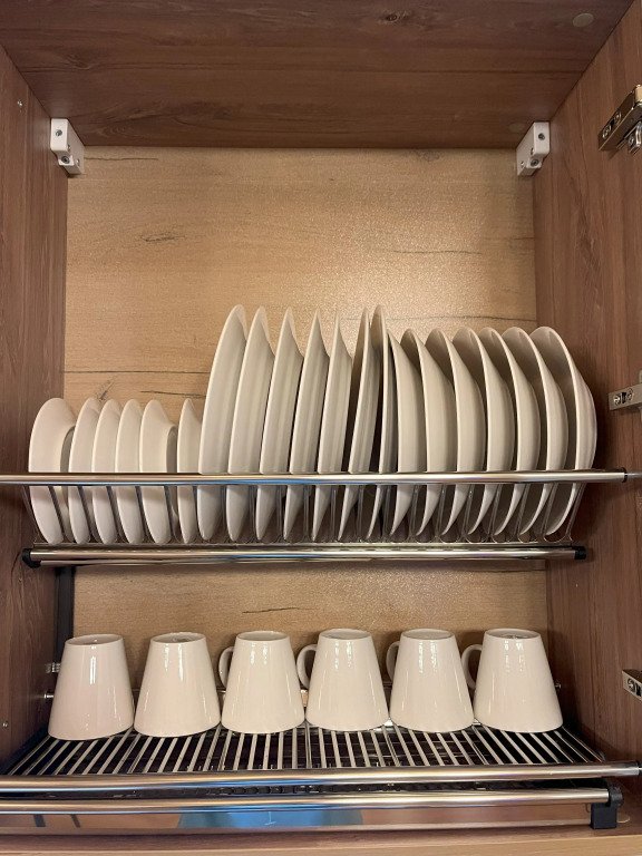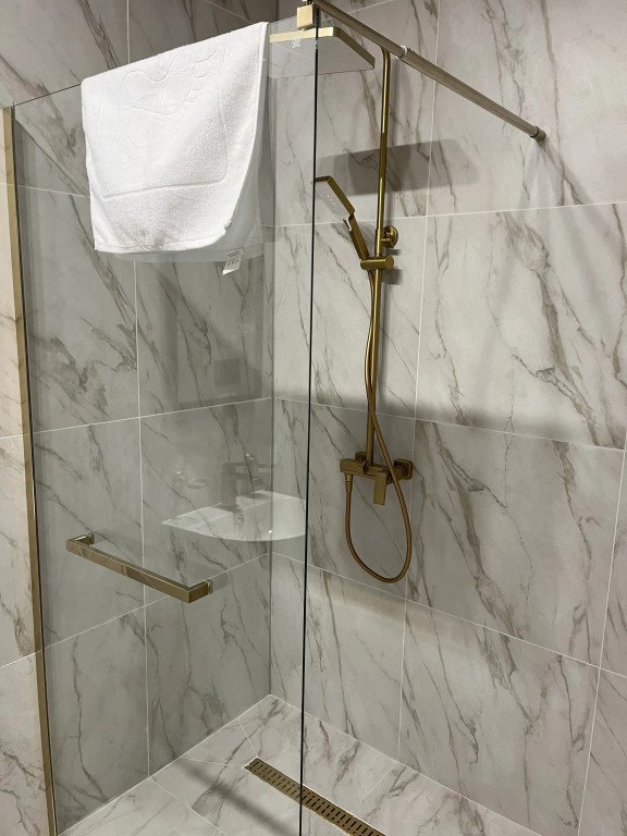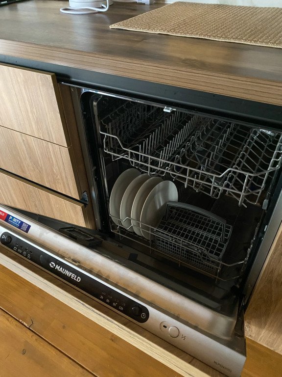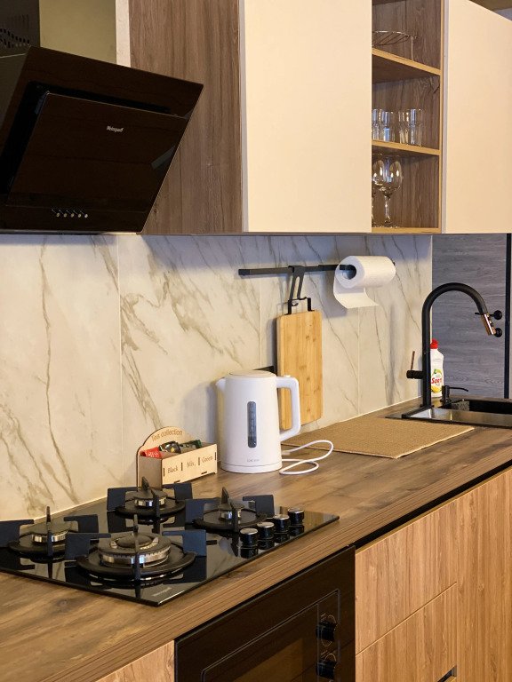 Кухня оборудована кухонными принадлежностями и посудой. Ванная комната оснащена душем.