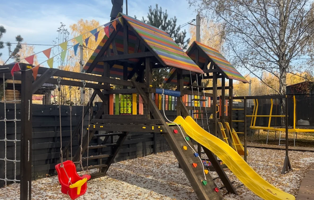 Детская площадка на свежем воздухе для детей всех возрастов. Безопасные качели, яркие горки и мини-скалодром для веселого времяпровождения. Площадка окружена зеленью, что делает ее идеальным местом для семейного отдыха среди природы.